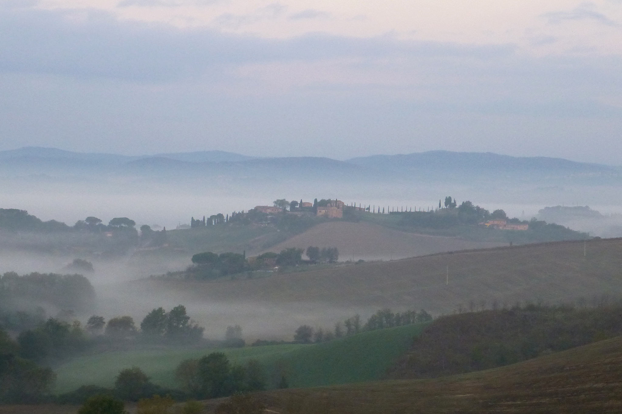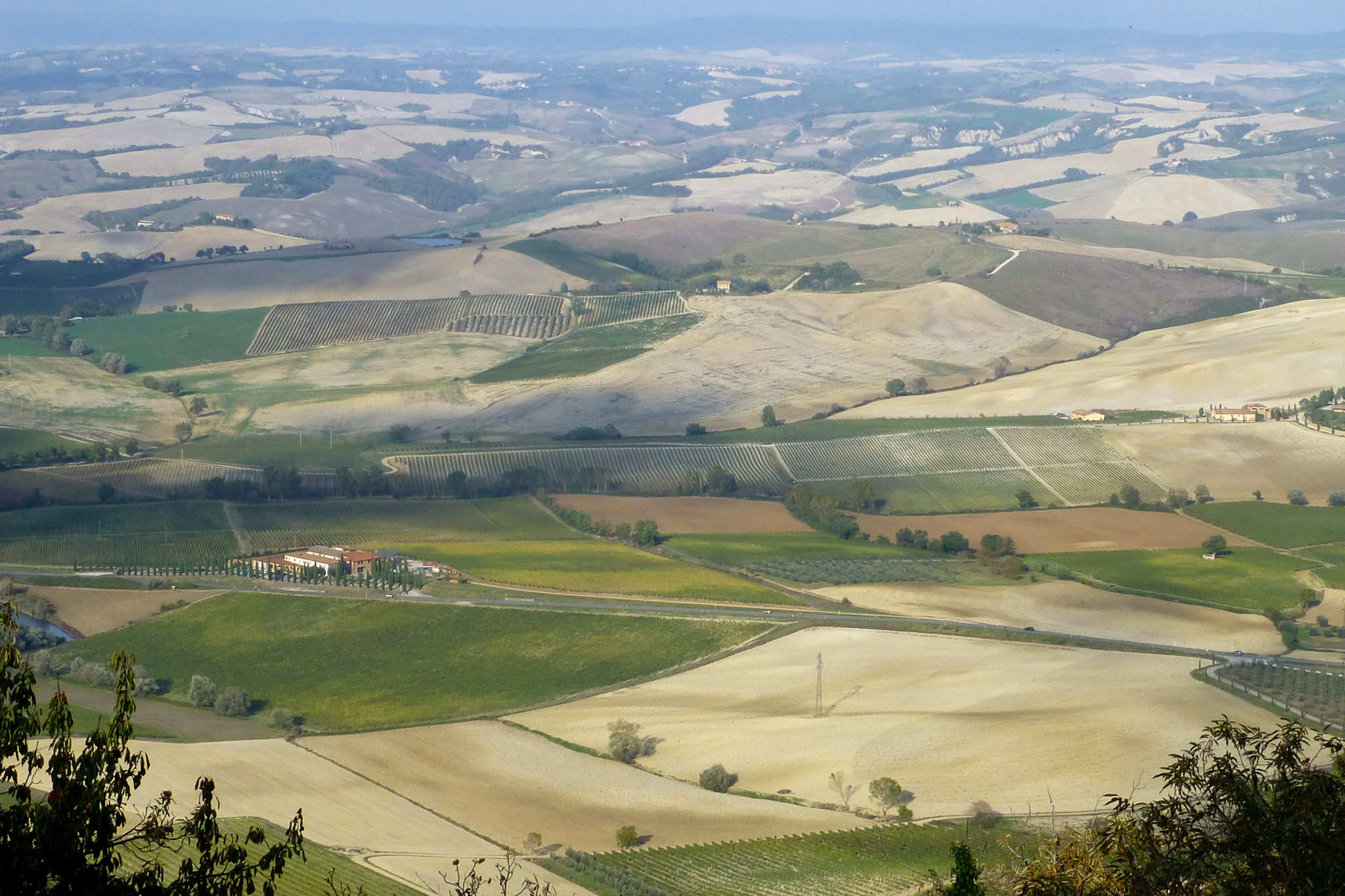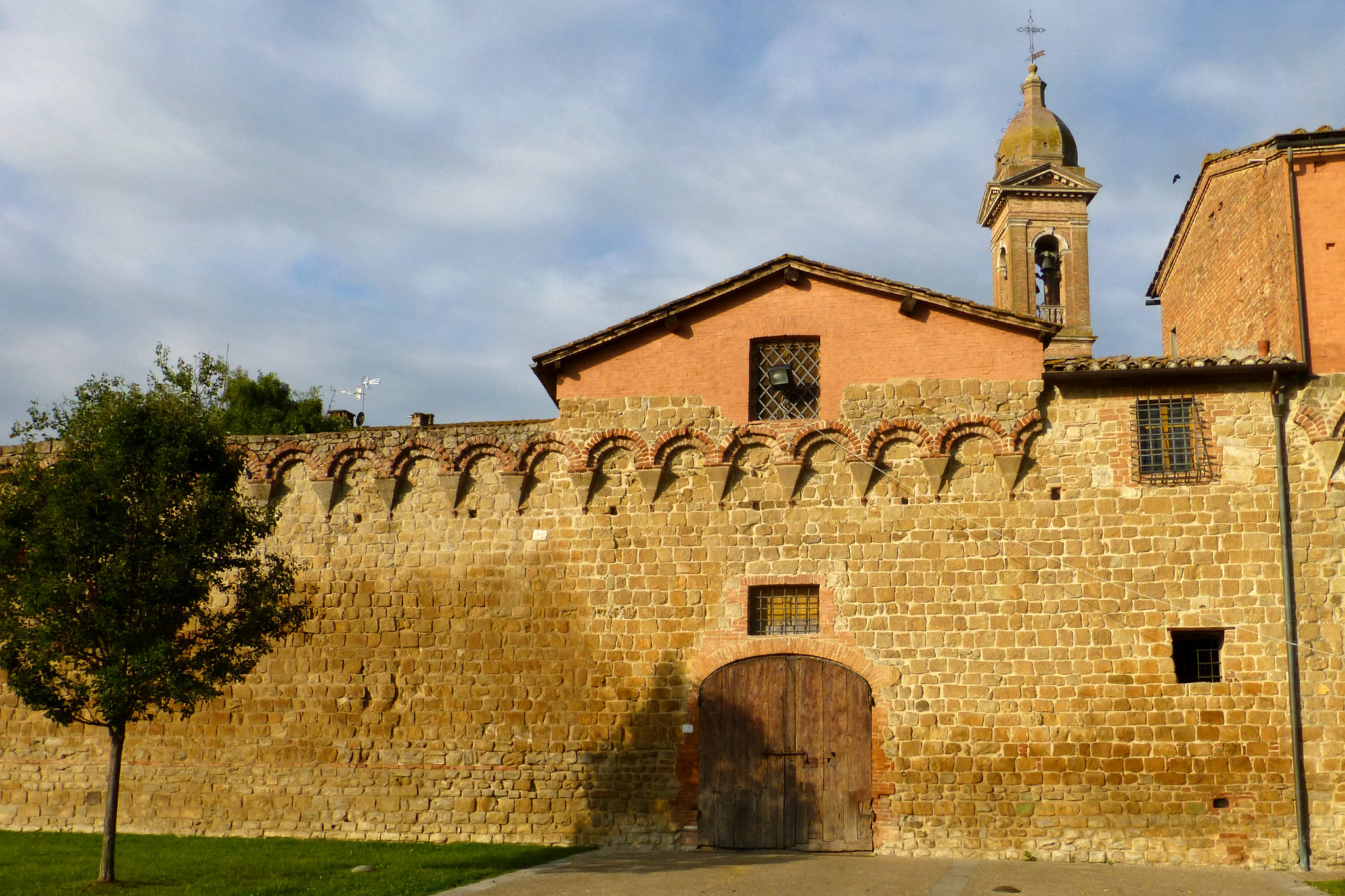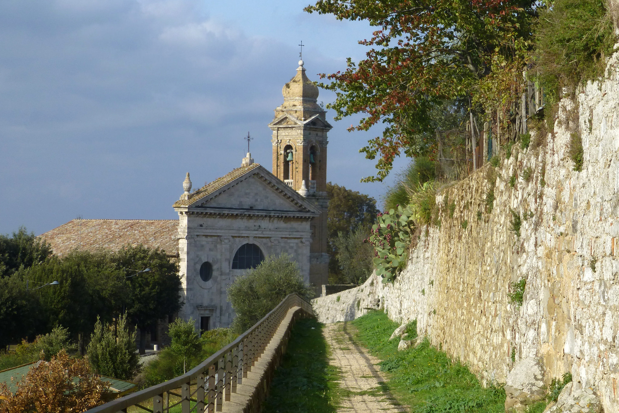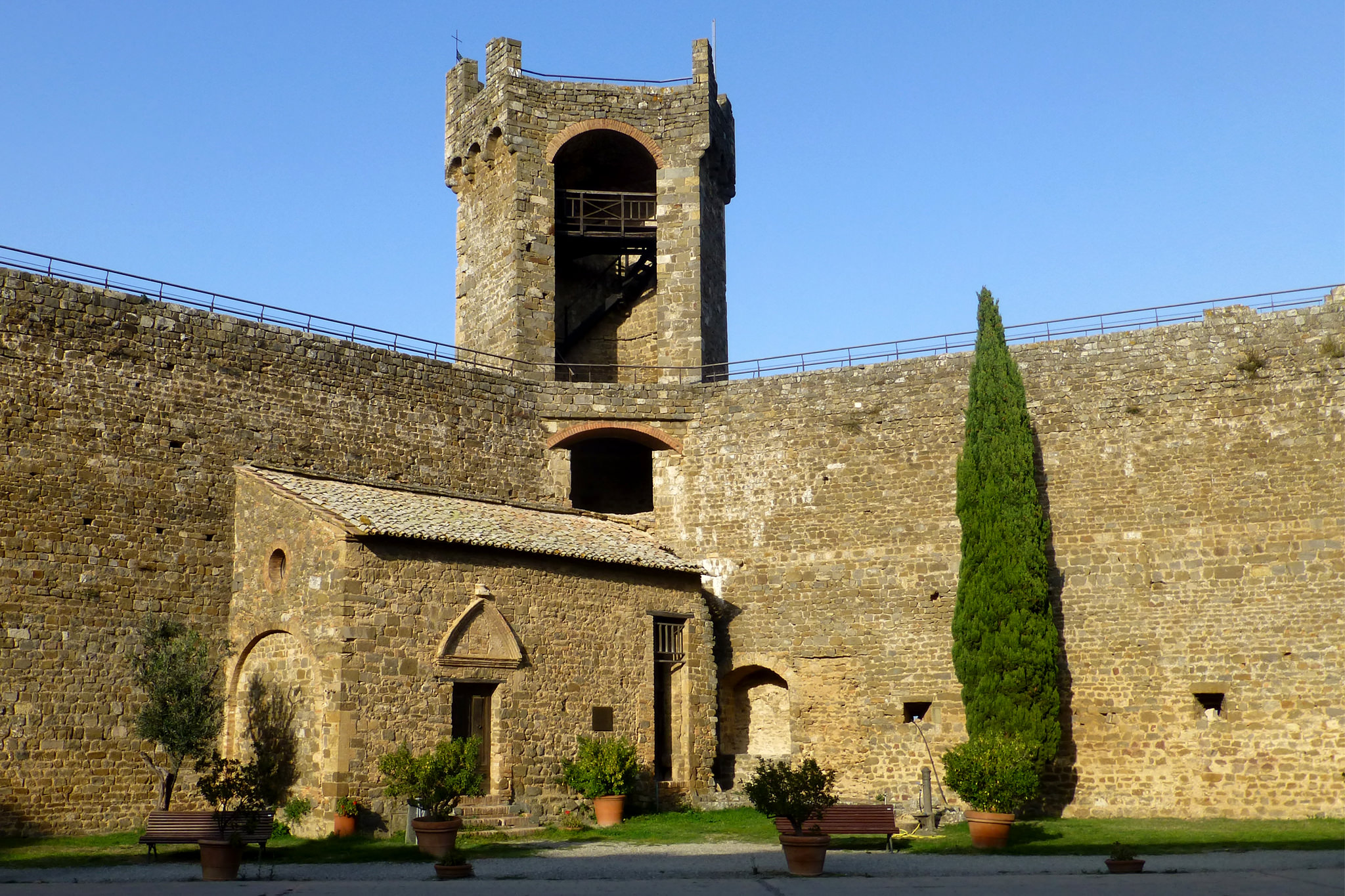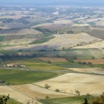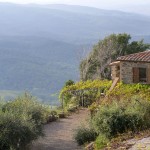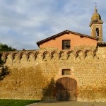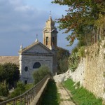 Auf der heutigen 8. Etappe nach Montalcino wurde mir auf einmal bewusst, welch ein Glück ich bisher mit dem Wetter habe. Zum ersten Mal schien unterwegs nämlich nicht die Sonne und es war bedeckt (was mich direkt dazu verleitet hat, die Strecke um ein paar Kilometer zu verlängern). Aber typisch… wie so oft bemerkt man erst was man hatte, wenn es nicht mehr da ist. Und wenn es nur ein paar Sonnenstrahlen sind. Während die gestrigen Highlights unterwegs quasi am Wegesrand lagen, stellte sich heute das Ziel meiner Etappe als wirklich sehenswert dar. Und das Schöne… rechtzeitig bei meiner Ankunft in Montalcino ließ sich auch die Sonne wieder blicken. Die Stadt liegt, wie sollte es auch anders sein, auf einer Anhöhe und gestattet einen herrlichen Ausblick auf die umgebenden Weinbaugebiete. Hier wird einer der besten und teuersten Weine Italiens, der Brunello, angebaut. Der gute Tropfen ist leider schuld daran, dass sich recht viele Touristen hierhin verirren. Montalcino selbst hat ein sehr schönes Zentrum mit kleinen, engen Gassen und wird von einer beeindruckenden, alten Stadtmauer umgeben.