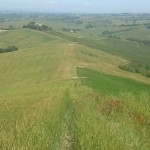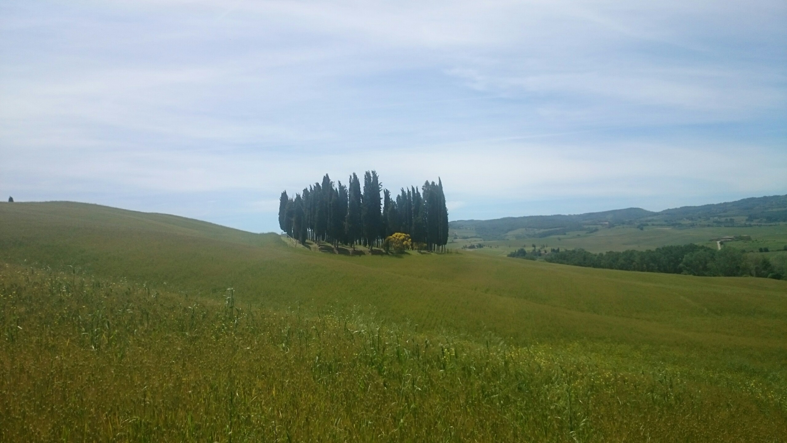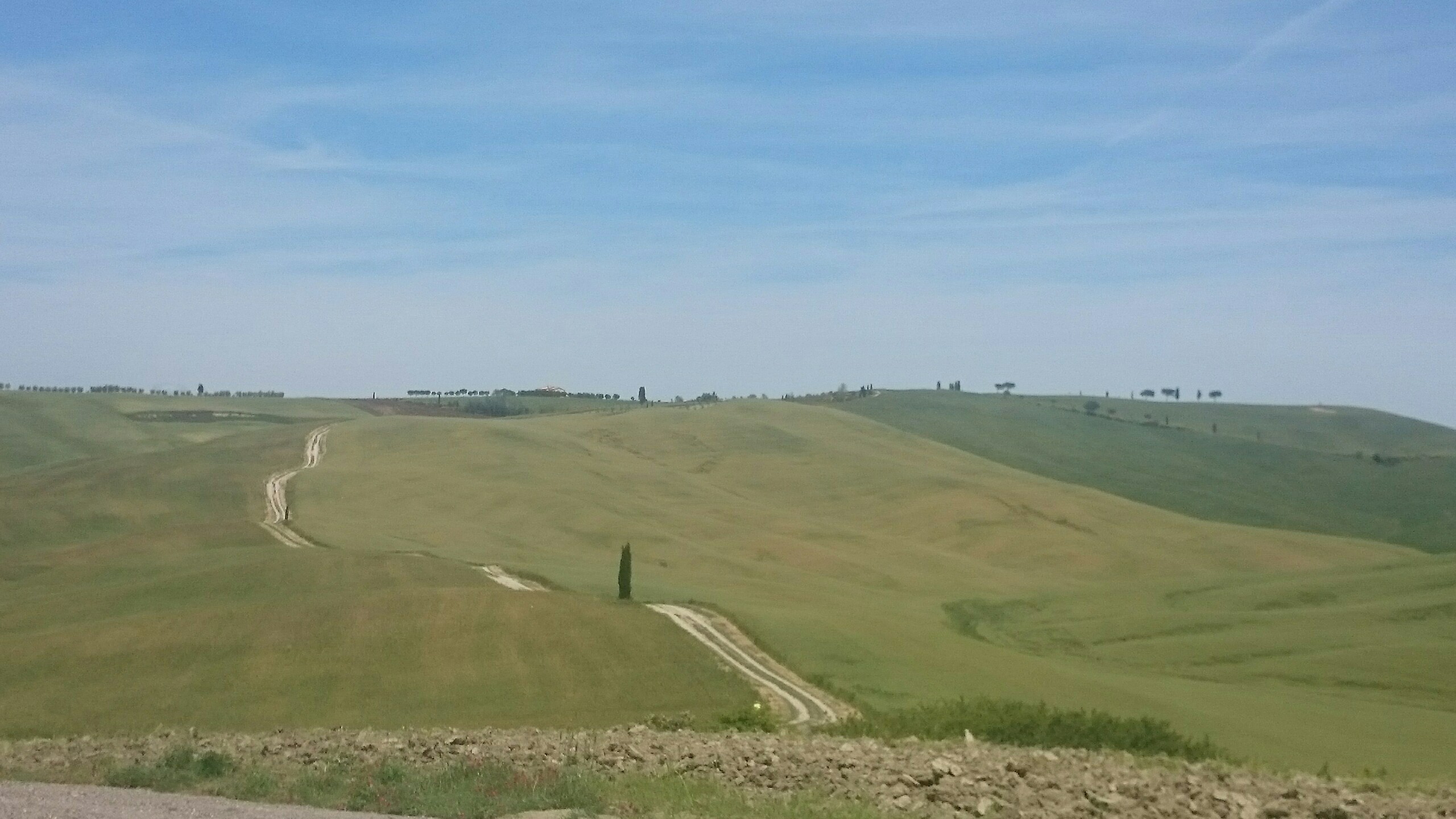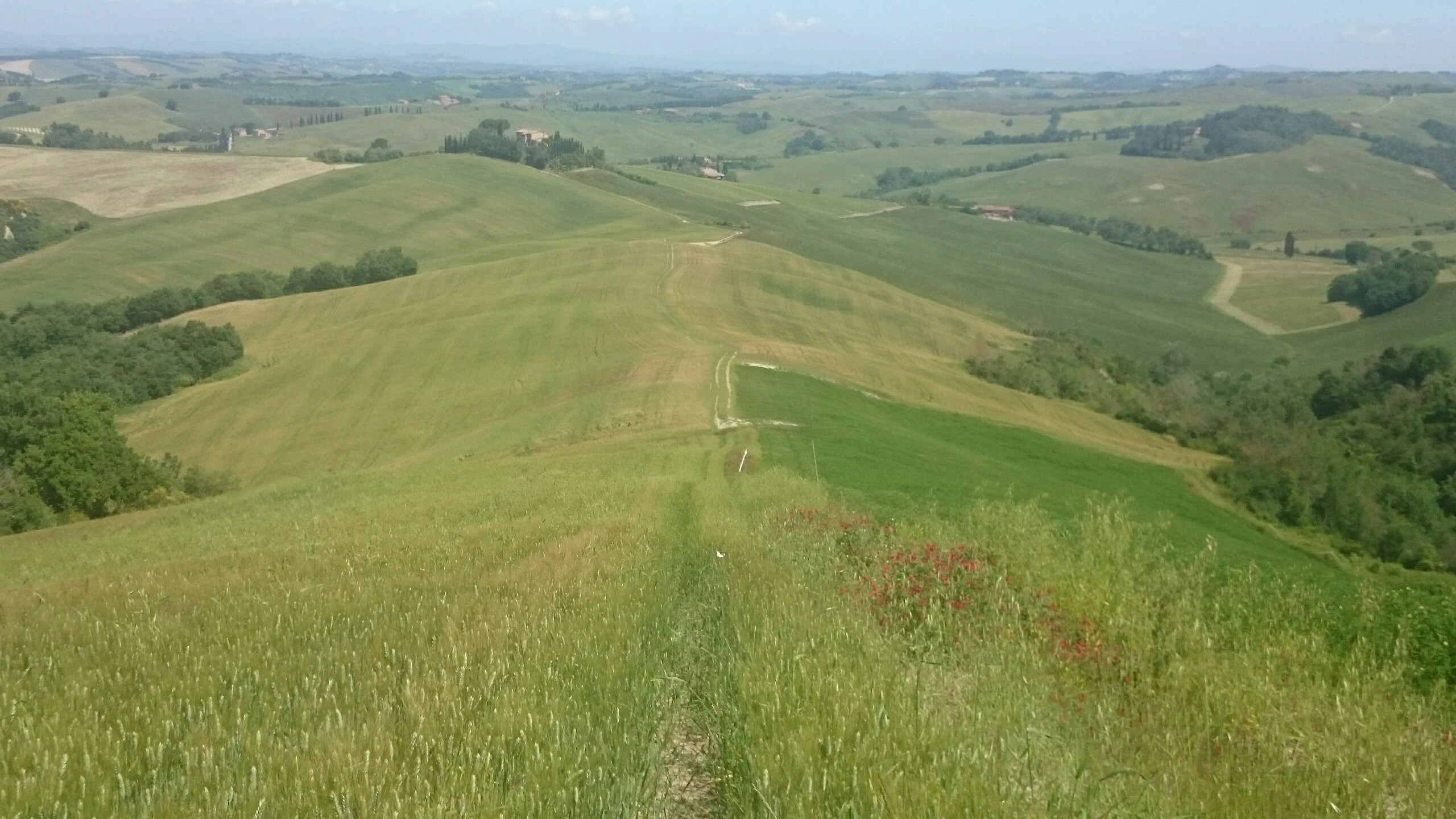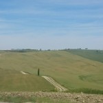 Ich hatte im Internet mal ein Foto der „cipressi triboli“ gesehen und wollte unbedingt dorthin. Heute war ich da und habe selber Fotos gemacht. Man muss einfach hier in dieser tollen Landschaft sein, um die Faszination zu erleben, die von ein paar Bäumen ausgeht. Überhaupt war der Weg nach San Quirico d’Orcia unbeschreiblich schön… und ließ mich zumeist vergessen, dass ich heute früh aufgewacht war und merkte „ich hab‘ Rücken“. Ich bin übrigens einige Kilometer auf der Via Francigena gegangen und habe einen wirklich tollen Abschnitt dieses Pilgerwegs erwischt. Bestimmt habe ich irgendwann schon mal erwähnt, wie überwältigend es ist, über eine Anhöhe zu gehen und dabei die endlos weite Landschaft zu überblicken… und wenn man sich dann umdreht, in der Ferne die Strecke zu sehen, die man bereits zurückgelegt hat. Am Poggio Cambocci (stand auf einem Wegweiser) war ich mir heute ziemlich sicher, mich wieder verlaufen zu haben. Und das, nachdem ich eine gute halbe Stunde, meistens bergauf, querfeldein marschiert war. Mit jedem Schritt wurde ich unsicherer und zweifelte zunehmend daran, noch richtig unterwegs zu sein. Bis aus dem Nichts auf einmal „mein Weg“ auftauchte. Ich war echt erleichtert und froh, mich nicht verlaufen zu haben und wieder zu wissen, wo es lang geht. Fast wie im richtigen Leben.