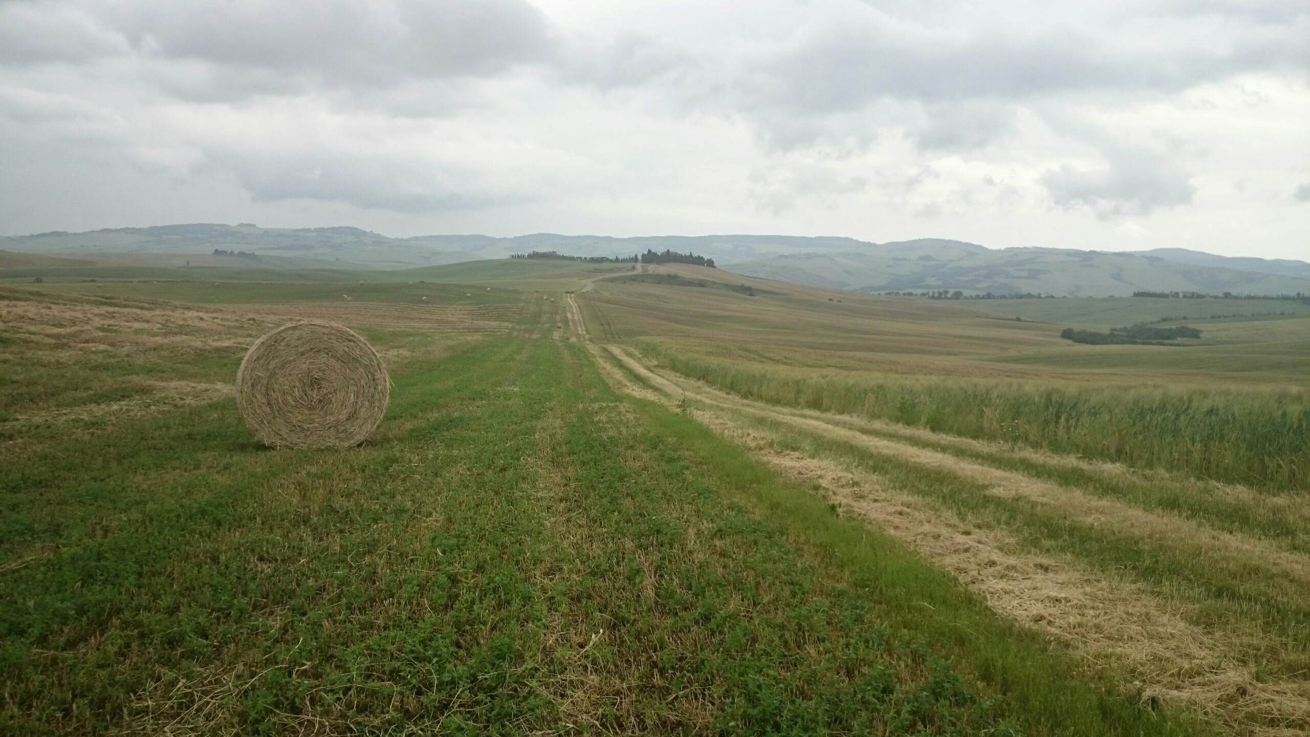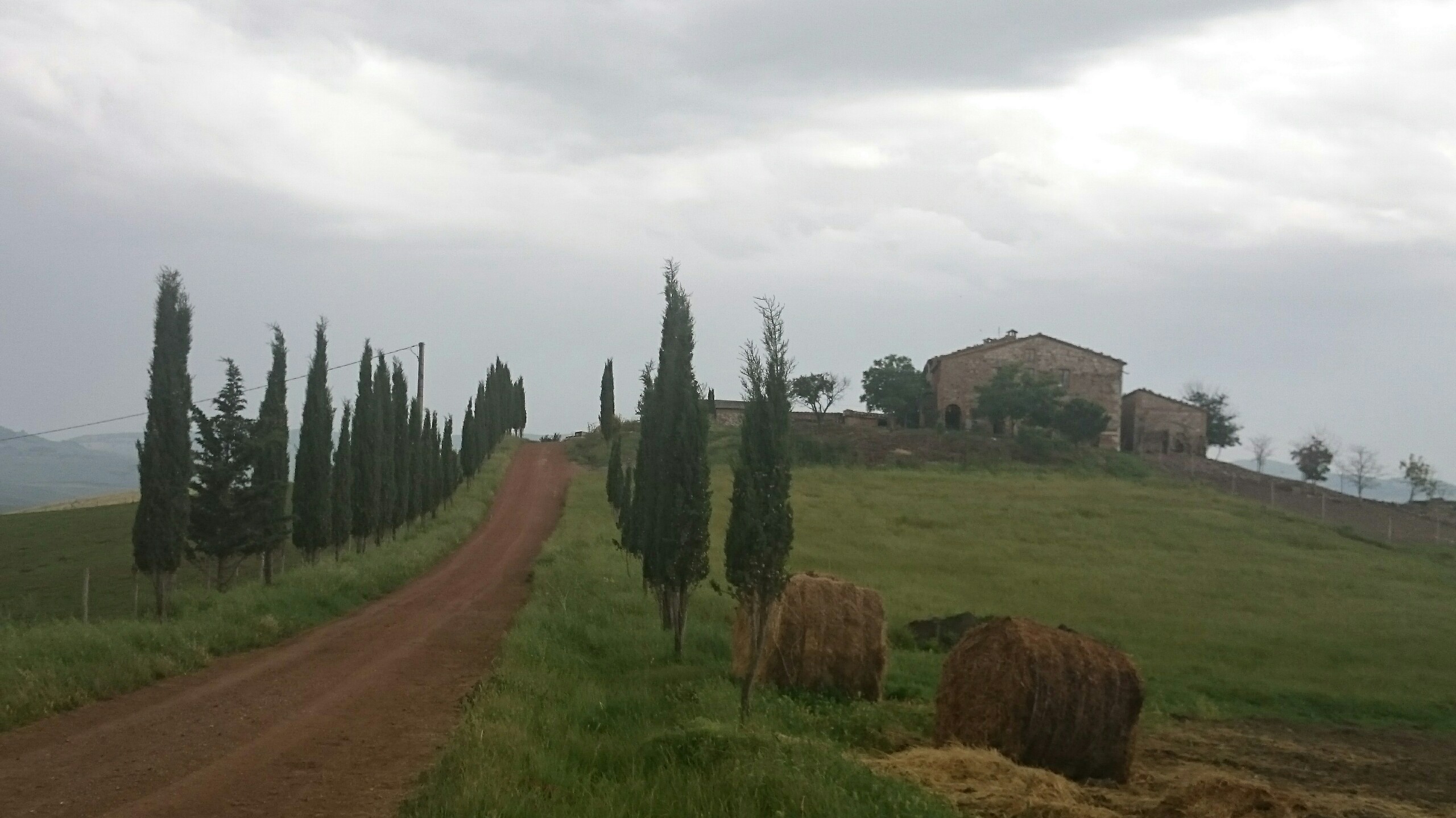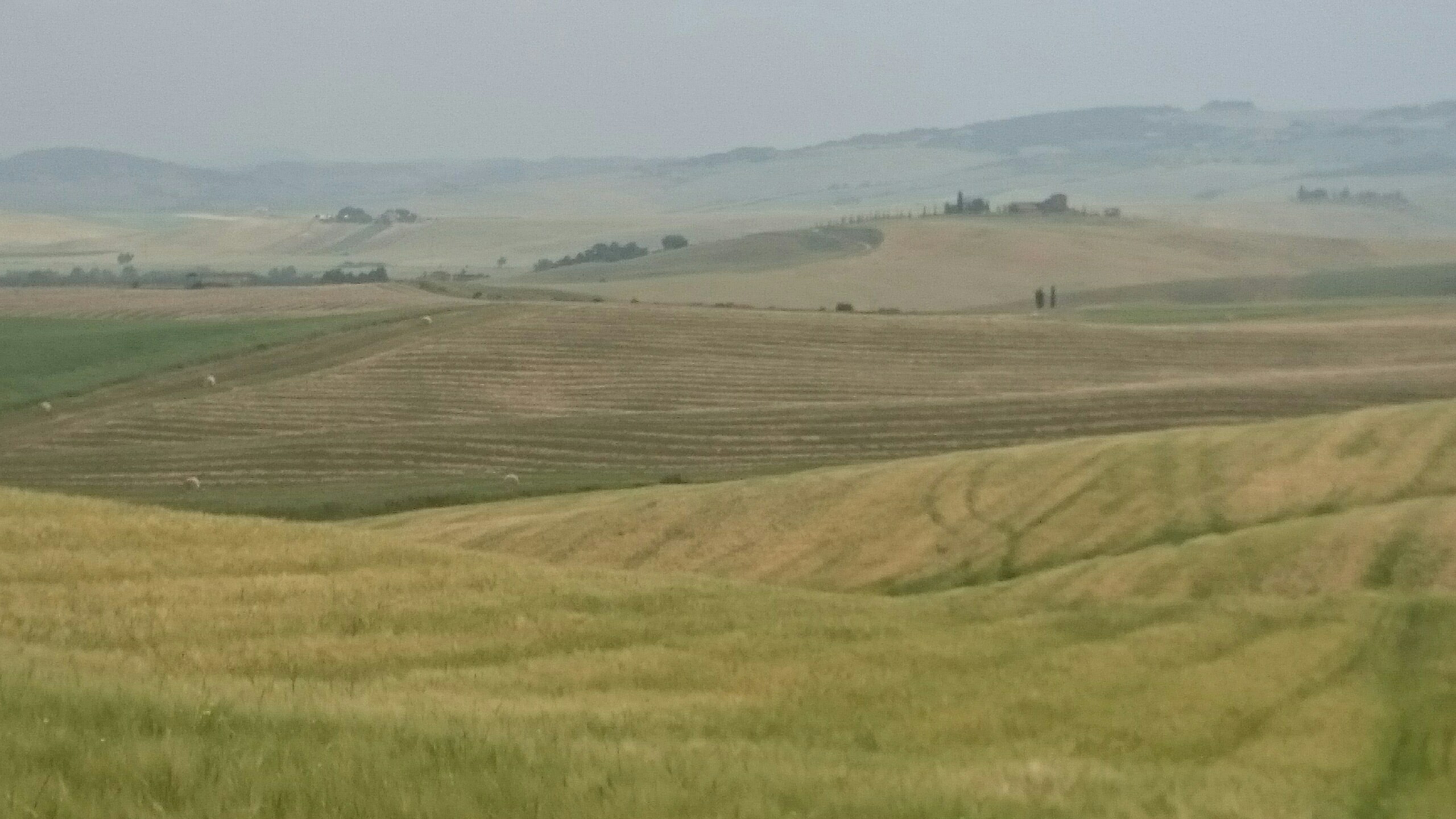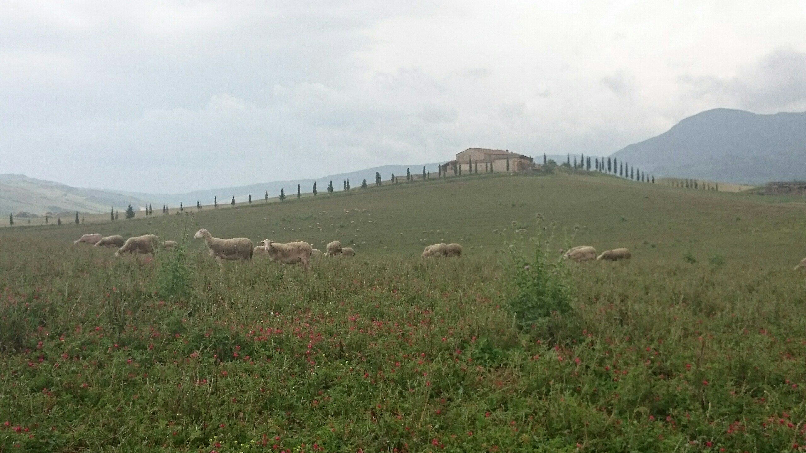 Gleich zwei Dinge sind mir heute passiert, die ich bisher hier so nicht kannte. Ich bin zeitweise im Regen gegangen und ich habe mich mitnehmen lassen (ca. 400 m weit). Gerade als es so richtig heftig anfing zu regnen und ich Sorge hatte in ein Gewitter zu laufen, kam Joseph auf dem Traktor angefahren. Joseph hieß natürlich Giuseppe und hat mich bis zu seinem Hof mitgenommen. Unterwegs hat er mir dabei den Tipp gegeben, einfach quer über seine Schafswiesen zu gehen… wäre die schönere Strecke. Und das war sie auch. Ich bin mir ziemlich sicher, dass die heutigen Fotos nicht ansatzweise das wiedergeben können, was ich gesehen habe. Für mich ist das Val d’Orcia einfach der Hammer… selbst bei diesem Wetter, das im Laufe des Tages übrigens immer besser wurde. Castelluccio, La Foce und schließlich mein heutiges Ziel Monticchiello… einfach nur schön. Witzigerweise schmerzt heute auch alles nur halb so sehr.