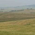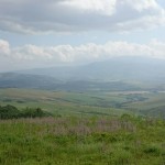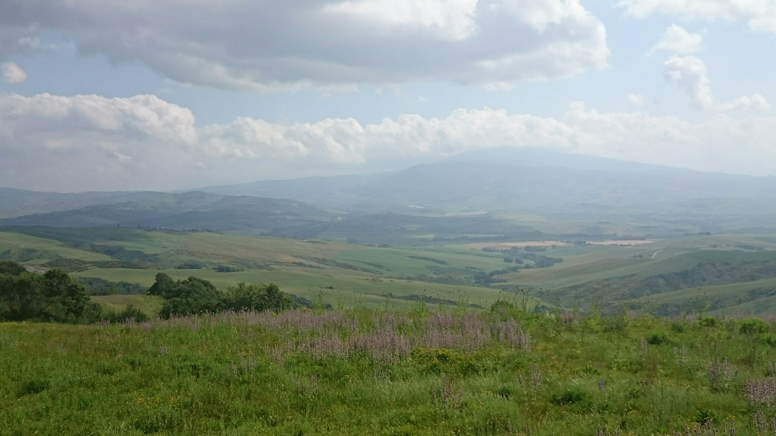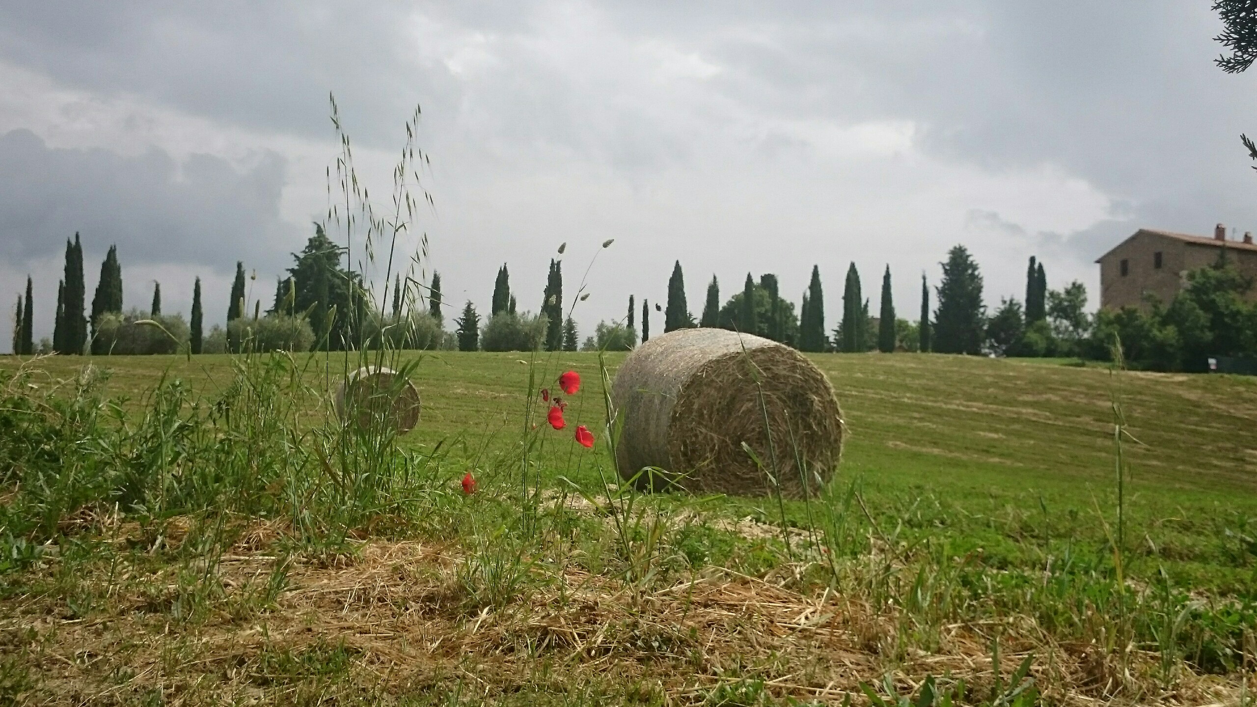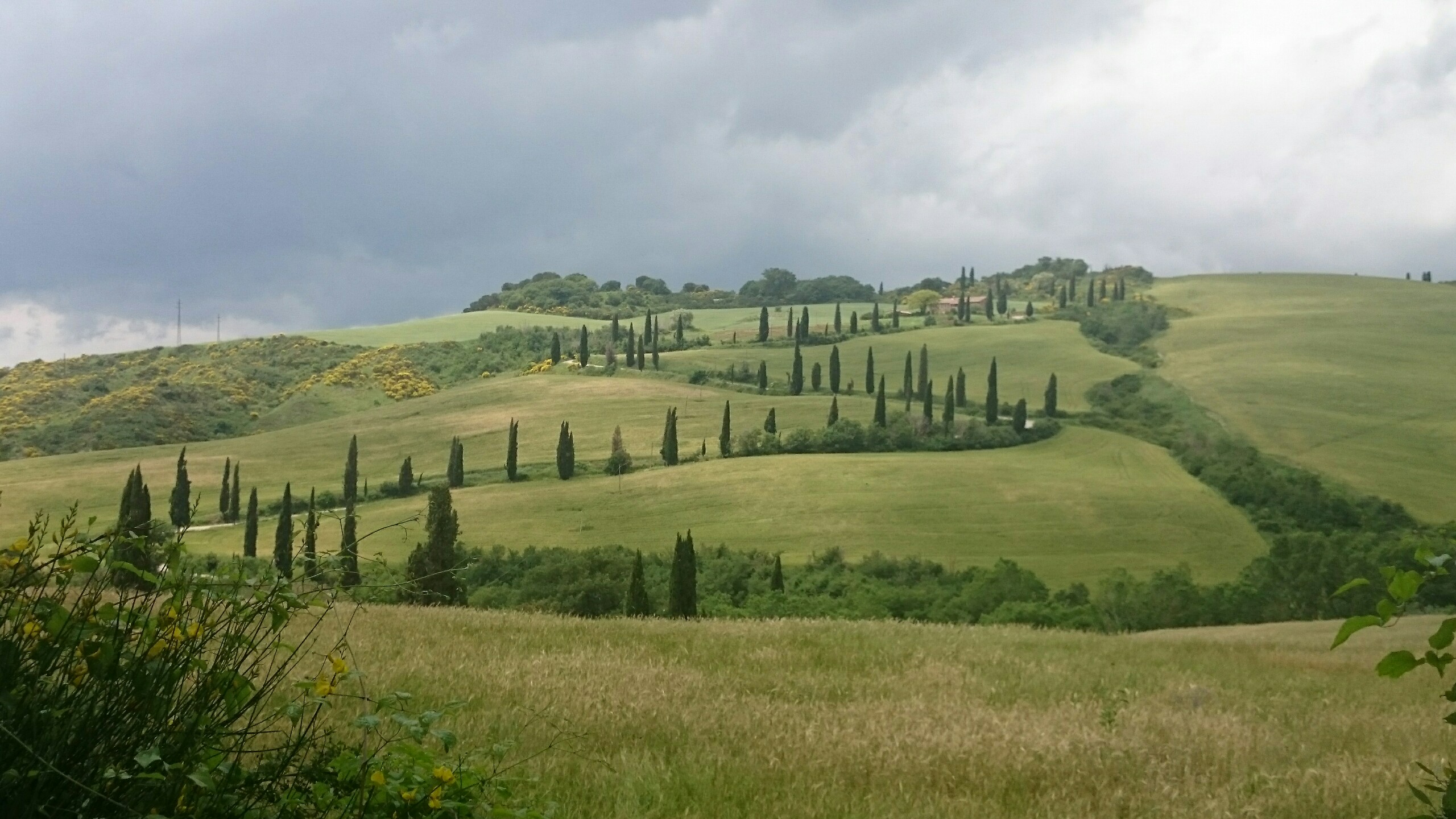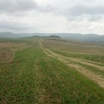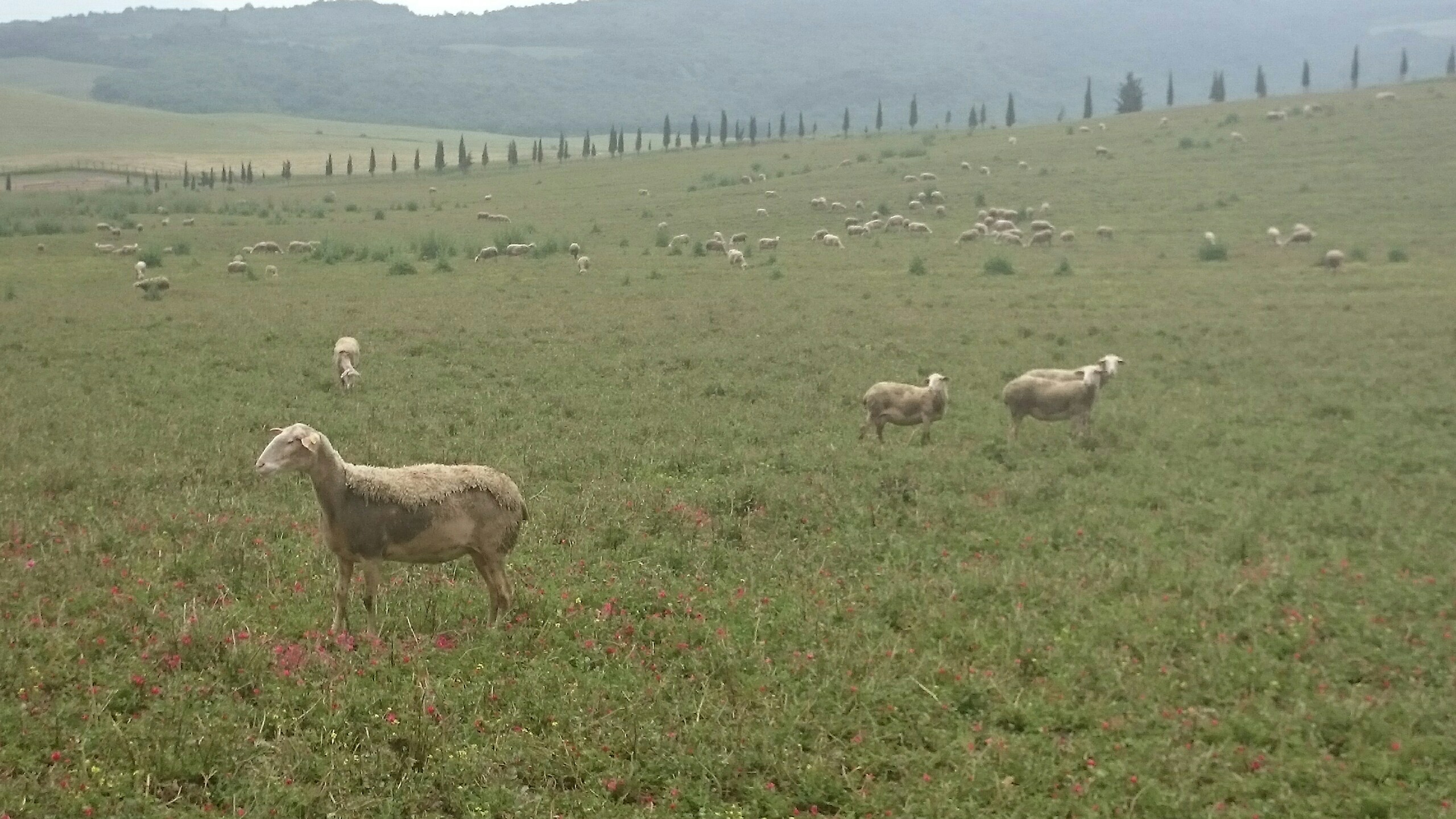 Gleich zwei Dinge sind mir heute passiert, die ich bisher hier so nicht kannte. Ich bin zeitweise im Regen gegangen und ich habe mich mitnehmen lassen (ca. 400 m weit). Gerade als es so richtig heftig anfing zu regnen und ich Sorge hatte in ein Gewitter zu laufen, kam Joseph auf dem Traktor angefahren. Joseph hieß natürlich Giuseppe und hat mich bis zu seinem Hof mitgenommen. Unterwegs hat er mir dabei den Tipp gegeben, einfach quer über seine Schafswiesen zu gehen… wäre die schönere Strecke. Und das war sie auch. Ich bin mir ziemlich sicher, dass die heutigen Fotos nicht ansatzweise das wiedergeben können, was ich gesehen habe. Für mich ist das Val d’Orcia einfach der Hammer… selbst bei diesem Wetter, das im Laufe des Tages übrigens immer besser wurde. Castelluccio, La Foce und schließlich mein heutiges Ziel Monticchiello… einfach nur schön. Witzigerweise schmerzt heute auch alles nur halb so sehr.