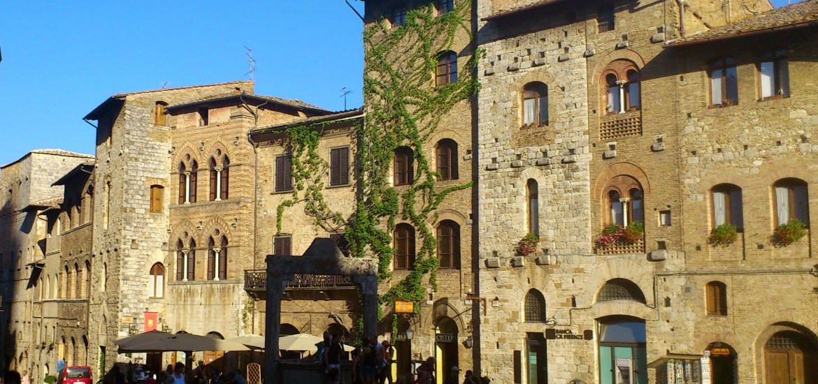 Ich sitze „ganz weit oben auf einem Berg“ in San Gimignano und trinke ein Glas Vernaccia di San Gimignano…