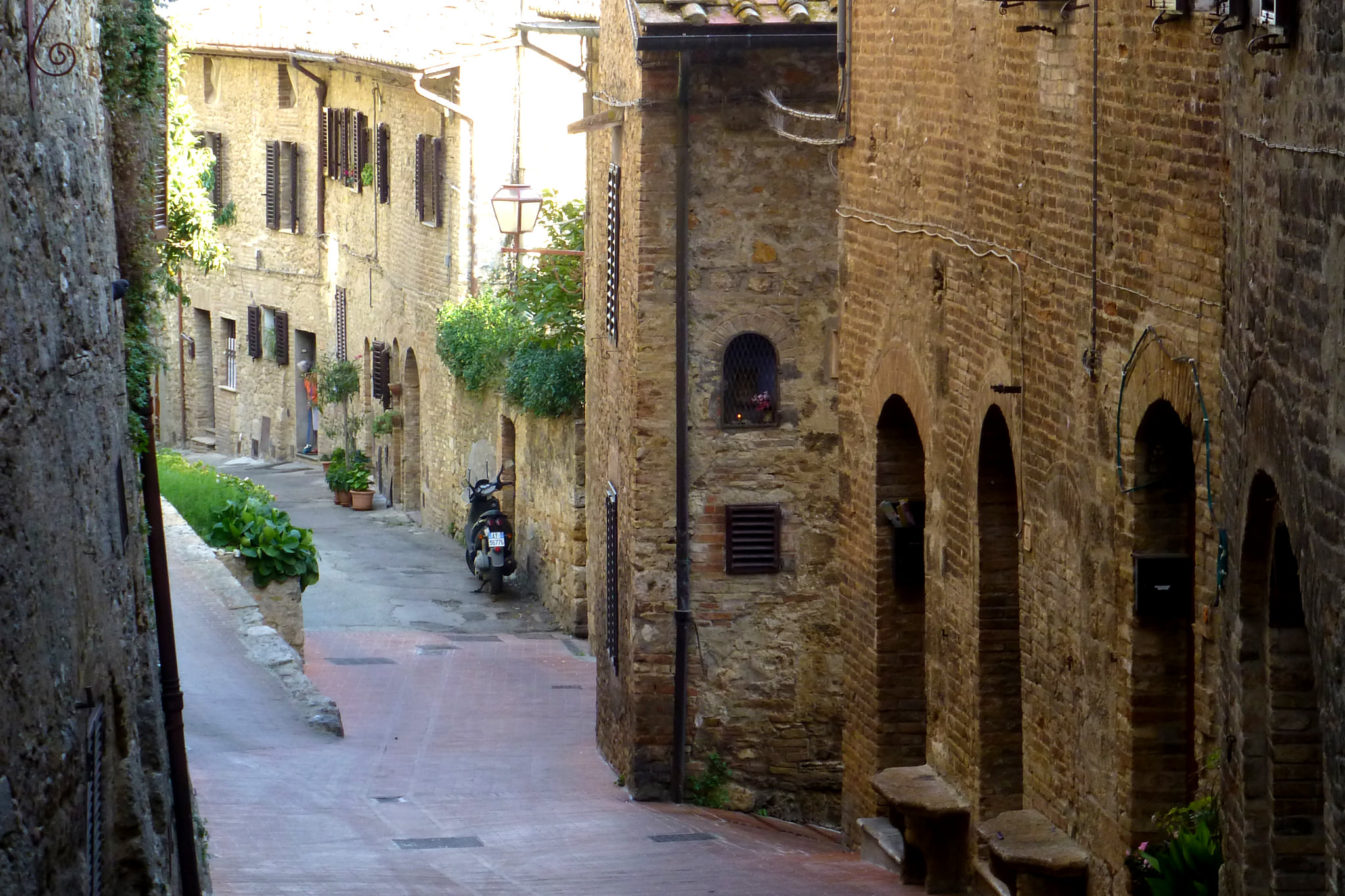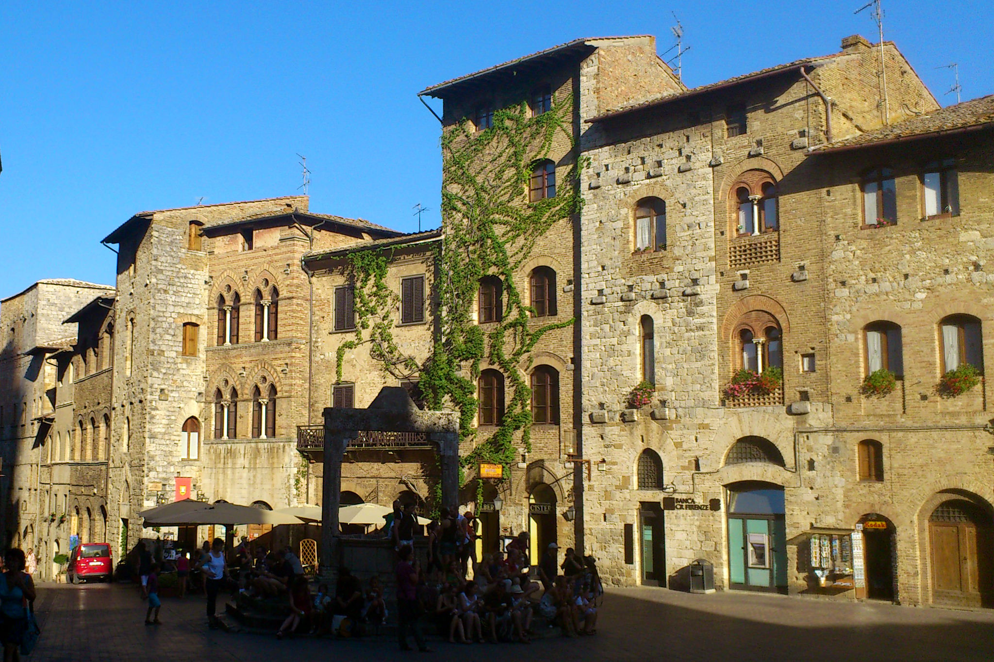 Ich sitze „ganz weit oben auf einem Berg“ in San Gimignano und trinke ein Glas Vernaccia di San Gimignano…