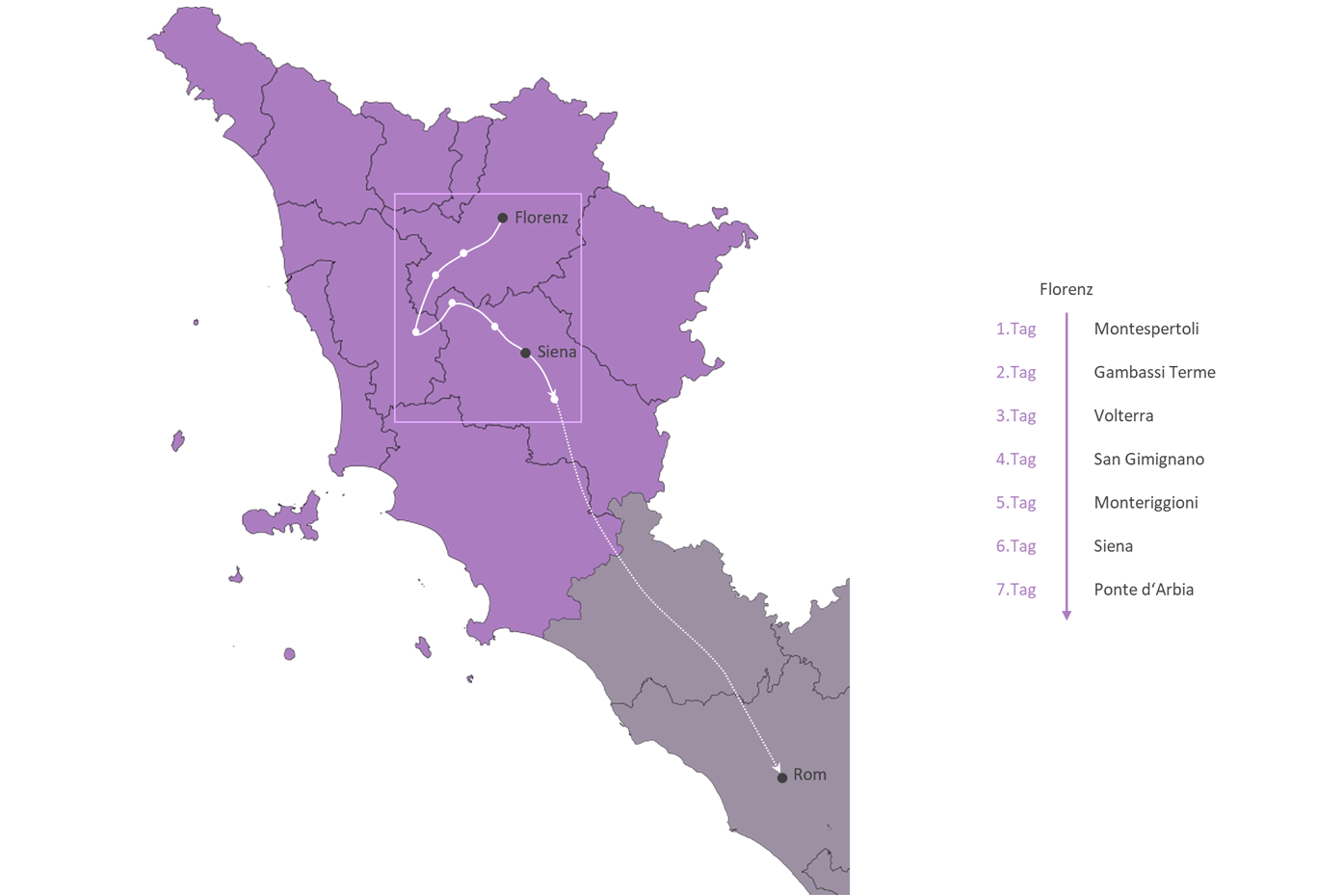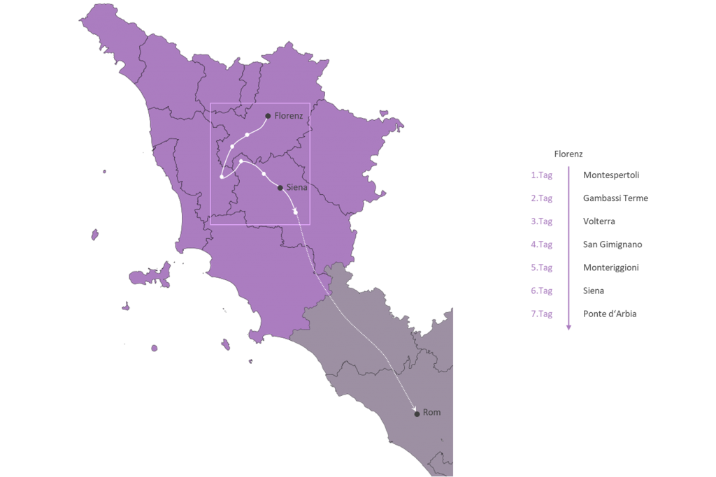 [Update zur Tour: Ein großer Nierenstein versperrte mir ab Ponte d’Arbia leider alle Wege nach Rom.]