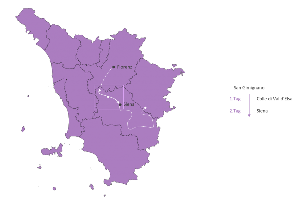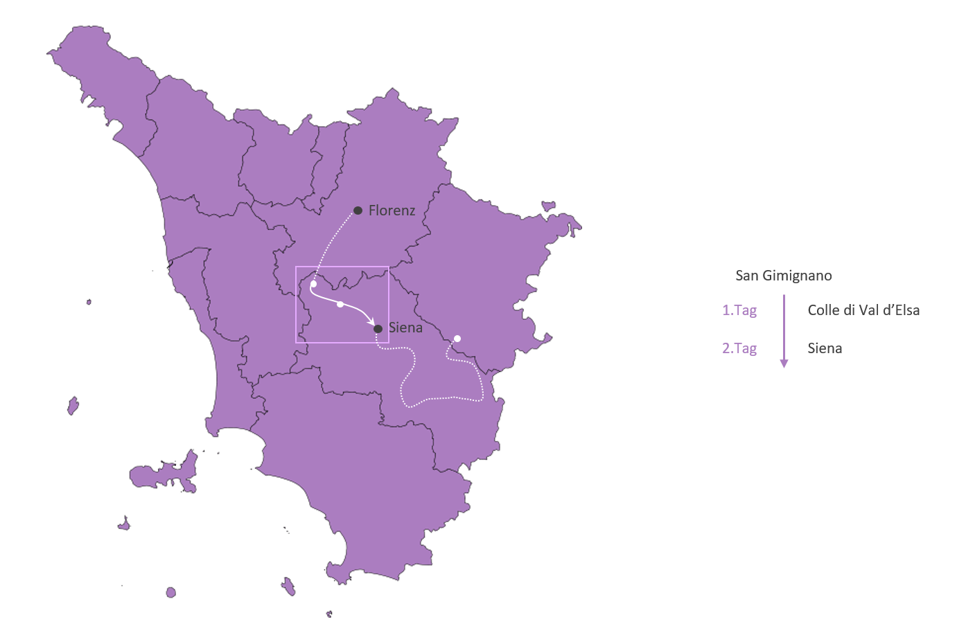 Auf ein Neues! Nicht mehr lange, dann startet meine nächste Tour durch die Toskana. Meine Reise wird diesmal in San Gimignano beginnen… einem meiner Lieblingsorte in der Toskana. Von dort werde ich am 30. August in Richtung Siena aufbrechen und anschließend die südöstlich von Siena gelegene Crete Senesi durchqueren. Ich bin sehr gespannt, was mich dort zu dieser Jahreszeit erwartet. Diese weitläufige Hügellandschaft weist gerade im Sommer einige wüstenartige Abschnitte auf. Mittendrin liegt die kleine und beschauliche Stadt Asciano, die wie im letzten Jahr eines meiner Etappenziele sein wird. Von dort führt mich meine Route, über kleine Umwege, in die für mich beeindruckendste Landschaft der Toskana… das Val d’Orcia. Vor allem die Region um San Quirico d’Orcia und Pienza haben es mir wirklich angetan, so dass ich dort einige Tage unterwegs sein werde. Schließlich geht es dann wieder ein wenig Richtung Norden. Meine Tour endet nach voraussichtlich zwölf Etappen und rund 300 Kilometern in dem kleinen, in der Nähe von Arezzo gelegenen Ort Lucignano. Auf Bildern gefällt mir das mittelalterliche Städtchen im Val di Chiana schon mal richtig gut. Ich bin neugierig, welches Wetter mich in vier Wochen in der Toskana erwartet und werde auf jeden Fall darauf achten, ausreichend Wasser dabei zu haben. In der Vergangenheit habe ich leider schon mal „schlechte Erfahrungen“ gemacht… und zuwenig Flüssigkeit mit Nierensteinen bezahlt. Je nach Temperatur werde ich meine Touren wohl sehr früh am Morgen starten, um so der Mittagshitze ein wenig auszuweichen. Vielleicht gelingen mir so auch ein paar schöne Fotos vom Sonnenaufgang. Wie auch immer… mein Plan steht im Wesentlichen, mal sehen was die Wirklichkeit daraus macht.