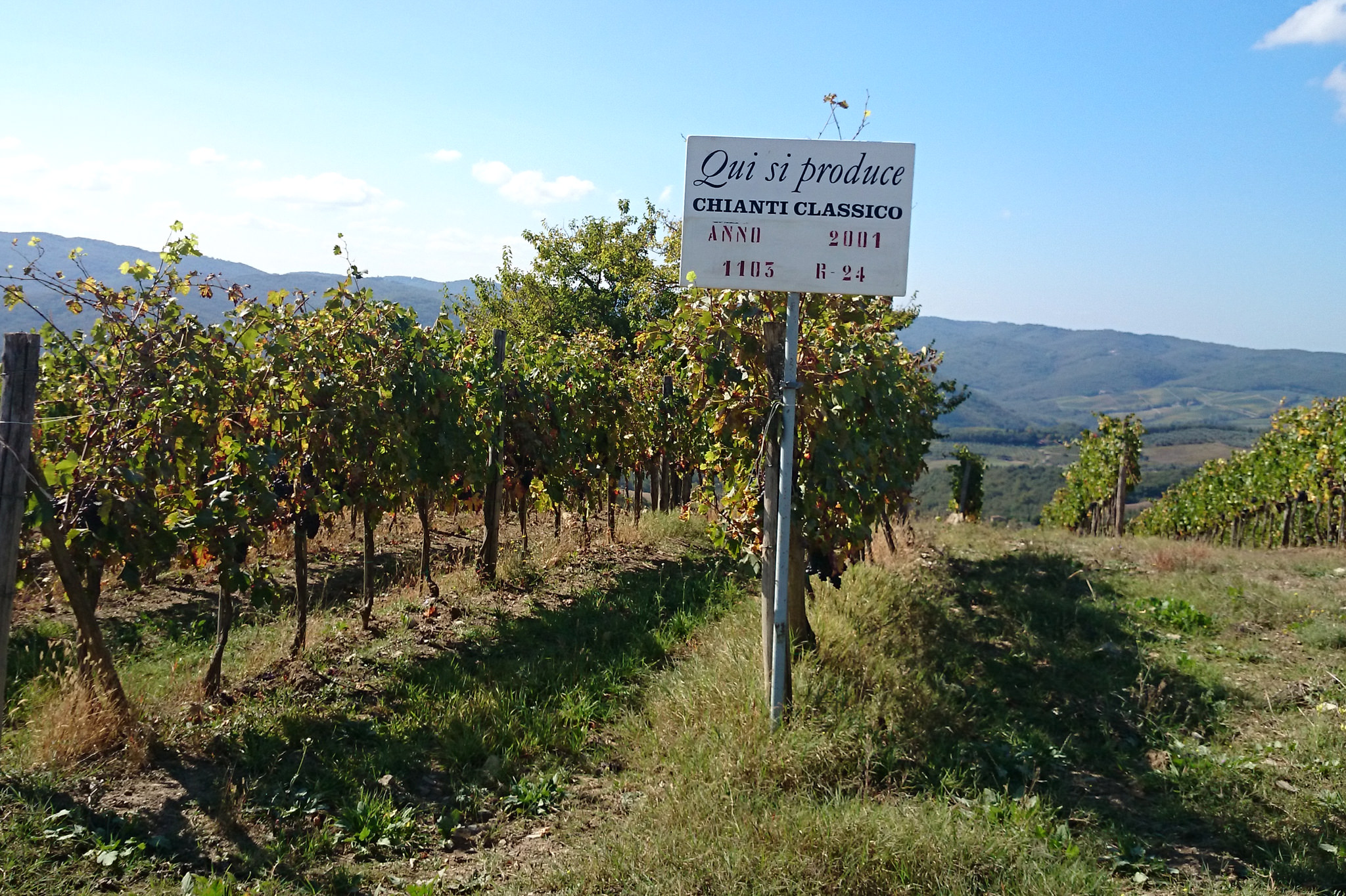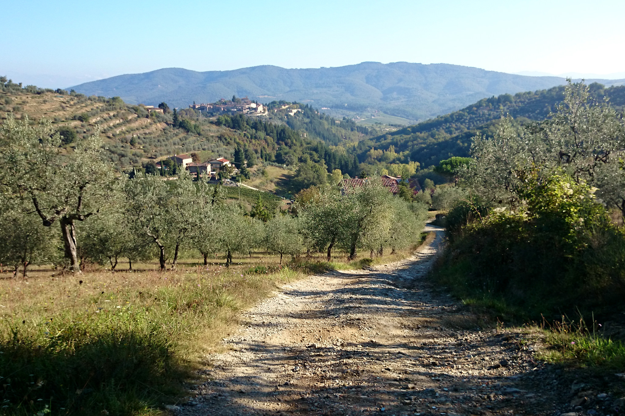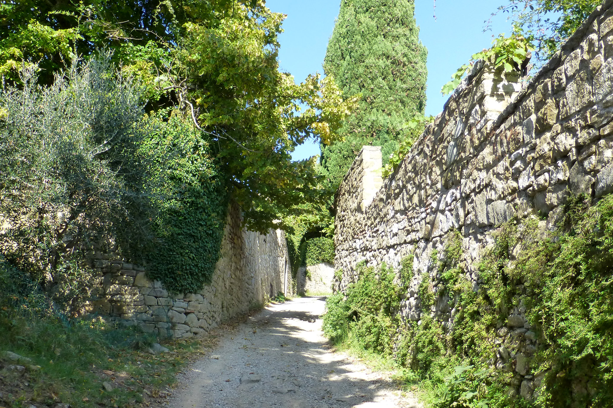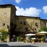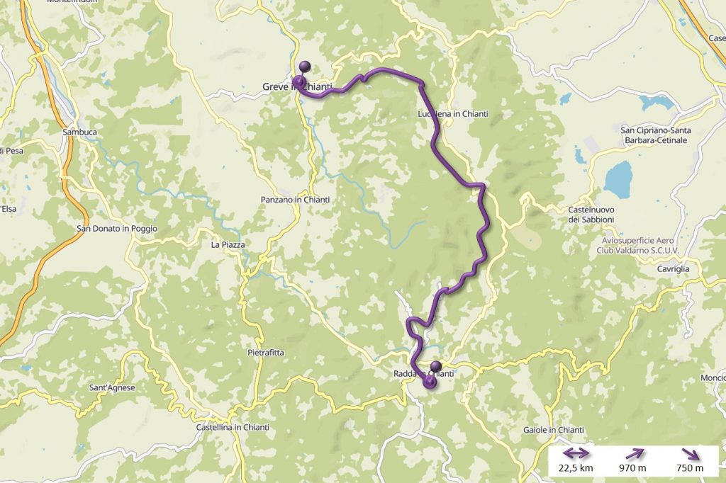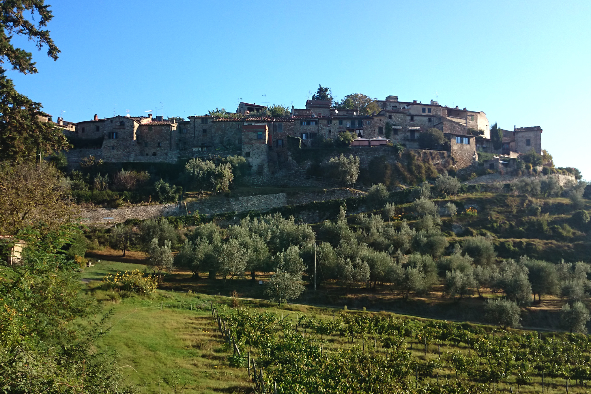 Nachdem ich gestern durch das Chianti-Gebiet marschiert bin und vor lauter Bäumen den Wein nicht gesehen habe, hat sich das auf der heutigen Strecke grundlegend geändert. Ein Weinberg folgte dem nächsten und alle Reben hingen voller Trauben. Sangiovese heißt die Traubensorte übrigens, die später bei einem Chianti den größten Anteil ausmachen. Einer dieser Weinberge warf mich heute vormittag leider etwas zurück, da er mir und meiner Route im Weg stand und aufgrund eines hohen Zaunes auch nicht zu durchqueren war. Das sollte aber heute für lange Zeit das einzige Missgeschick bleiben. Überhaupt war der Tag und die Strecke heute schöner als gestern. Es war gut, dass ich auf den gestrigen Rat gehört habe (irgendwie hatte ich wohl doch die entscheidenden Worte verstanden) und meine Route nochmal geändert habe. Die Strecke war dadurch zwar zwei Kilometer länger, führte aber durch drei tolle Orte… Montefioralle, Panzano und Volpaia, wobei mir Montefioralle am Besten gefallen hat. Lustig war, dass ich heute eine ganze Weile einen kleinen und sehr lebhaften Hund als Begleiter hatte. Mal lief er wedelnd vor mir her, mal sprang er aufgeregt neben mir durch’s Gras und schaute mich dabei fragend an. So plötzlich wie er aufgetaucht war, so unerwartet war er auch auf einmal wieder im Wald verschwunden. Kurz vor meinem Etappenziel durfte ich dann noch den Unterschied zwischen einem „online“ geplanten und einem wirklichen Weg feststellen. Die blaue Linie auf der Karte war da, der Weg aber weit und breit nicht zu sehen. Dieser unvorhergesehene Umweg war aber zum Glück überschaubar, so dass ich gegen 18:00 Uhr meine heutige Unterkunft in Radda erreicht habe. Sie rangiert leider auf Rang drei meiner bisherigen Unterkünfte, aber für eine Nacht ist sie ok. Praktisch an meinem Zimmer ist, dass meine morgige Etappe genau hier vor der Tür beginnt… vor allem, da die Strecke mit knapp 29 Kilometern die bislang längste wird. Ich hoffe mal, dass meine „Wehwehchen“ mir dann keinen Strich durch die Rechnung machen. Voltaren auf den Schultern, Tiger Balm auf den Waden und Bepanthen woanders müssen über Nacht helfen.