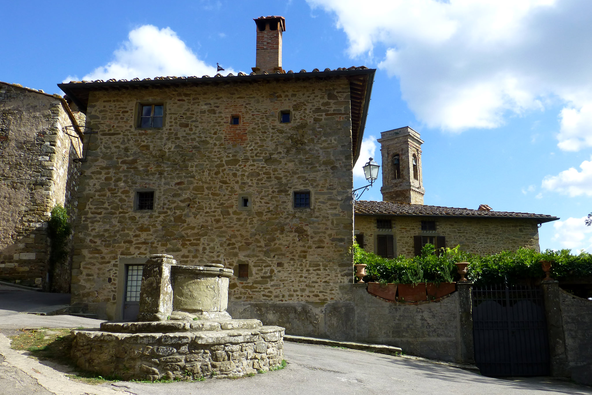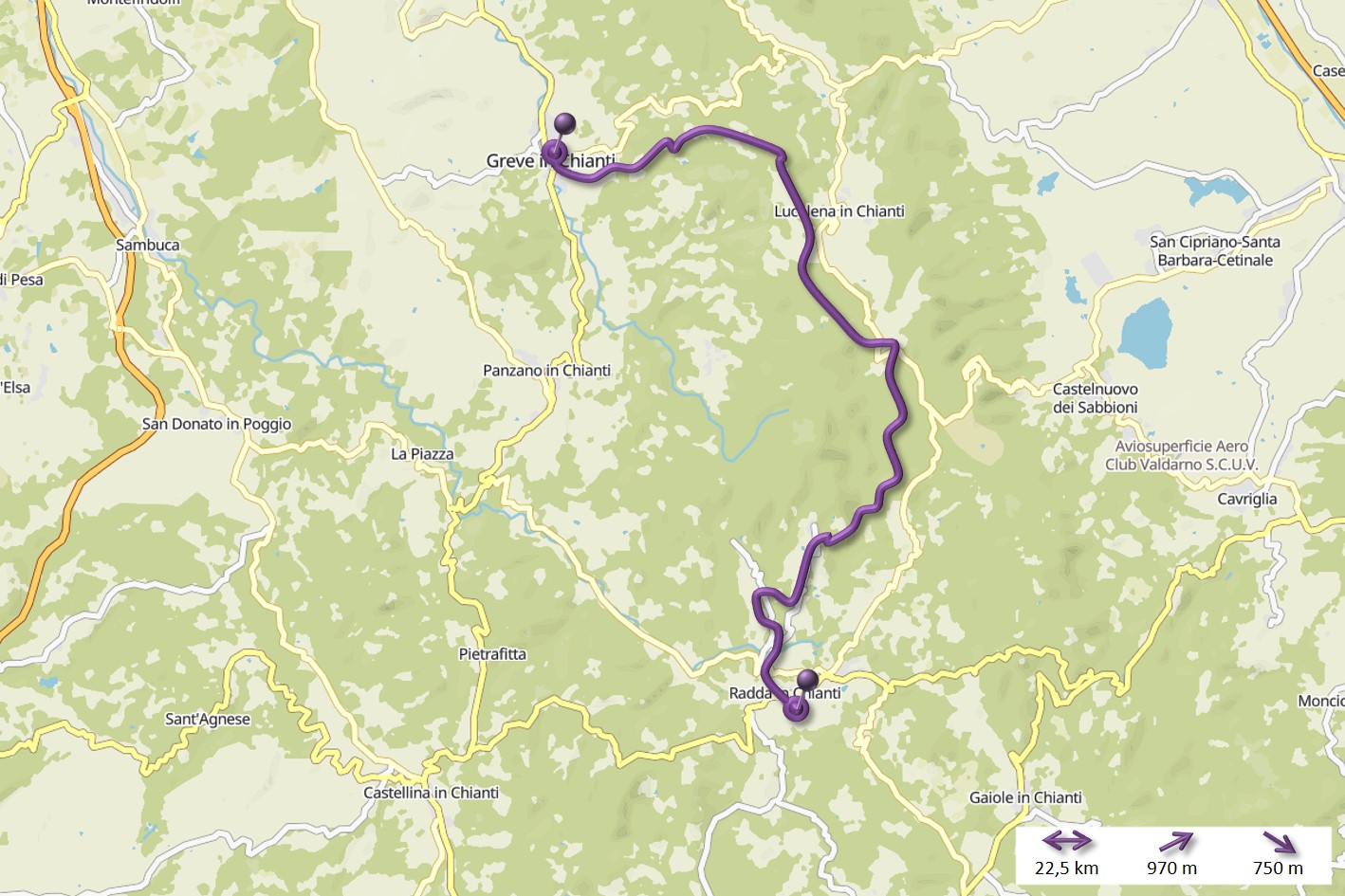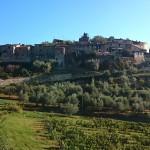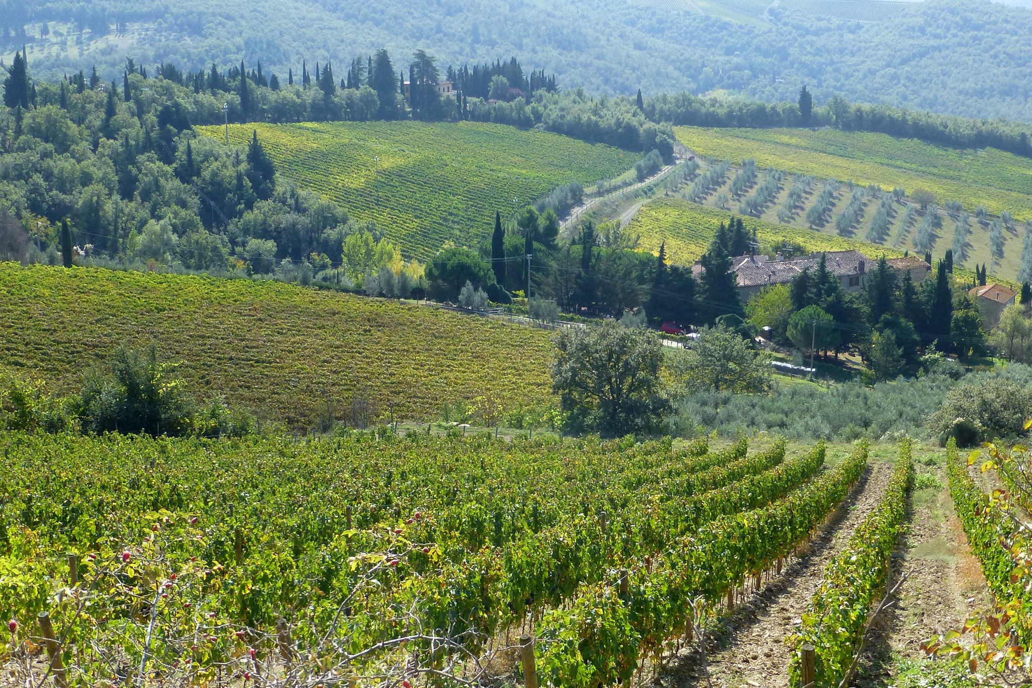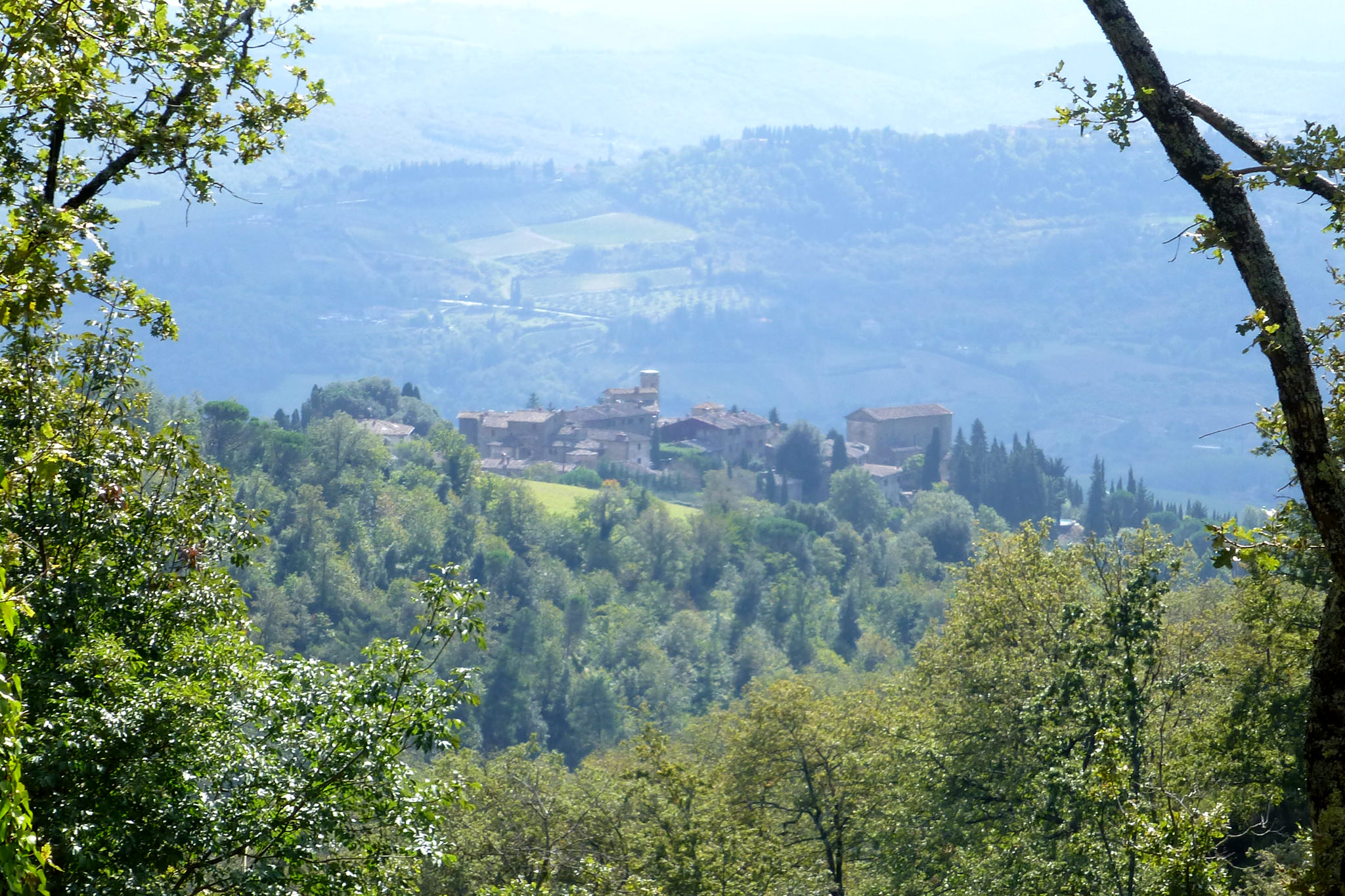 Nachdem ich gestern durch das Chianti-Gebiet marschiert bin und vor lauter Bäumen den Wein nicht gesehen habe, hat sich das auf der heutigen Strecke grundlegend geändert. Ein Weinberg folgte dem nächsten und alle Reben hingen voller Trauben. Sangiovese heißt die Traubensorte übrigens, die später bei einem Chianti den größten Anteil ausmachen. Einer dieser Weinberge warf mich heute vormittag leider etwas zurück, da er mir und meiner Route im Weg stand und aufgrund eines hohen Zaunes auch nicht zu durchqueren war. Das sollte aber heute für lange Zeit das einzige Missgeschick bleiben. Überhaupt war der Tag und die Strecke heute schöner als gestern. Es war gut, dass ich auf den gestrigen Rat gehört habe (irgendwie hatte ich wohl doch die entscheidenden Worte verstanden) und meine Route nochmal geändert habe. Die Strecke war dadurch zwar zwei Kilometer länger, führte aber durch drei tolle Orte… Montefioralle, Panzano und Volpaia, wobei mir Montefioralle am Besten gefallen hat. Lustig war, dass ich heute eine ganze Weile einen kleinen und sehr lebhaften Hund als Begleiter hatte. Mal lief er wedelnd vor mir her, mal sprang er aufgeregt neben mir durch’s Gras und schaute mich dabei fragend an. So plötzlich wie er aufgetaucht war, so unerwartet war er auch auf einmal wieder im Wald verschwunden. Kurz vor meinem Etappenziel durfte ich dann noch den Unterschied zwischen einem „online“ geplanten und einem wirklichen Weg feststellen. Die blaue Linie auf der Karte war da, der Weg aber weit und breit nicht zu sehen. Dieser unvorhergesehene Umweg war aber zum Glück überschaubar, so dass ich gegen 18:00 Uhr meine heutige Unterkunft in Radda erreicht habe. Sie rangiert leider auf Rang drei meiner bisherigen Unterkünfte, aber für eine Nacht ist sie ok. Praktisch an meinem Zimmer ist, dass meine morgige Etappe genau hier vor der Tür beginnt… vor allem, da die Strecke mit knapp 29 Kilometern die bislang längste wird. Ich hoffe mal, dass meine „Wehwehchen“ mir dann keinen Strich durch die Rechnung machen. Voltaren auf den Schultern, Tiger Balm auf den Waden und Bepanthen woanders müssen über Nacht helfen.