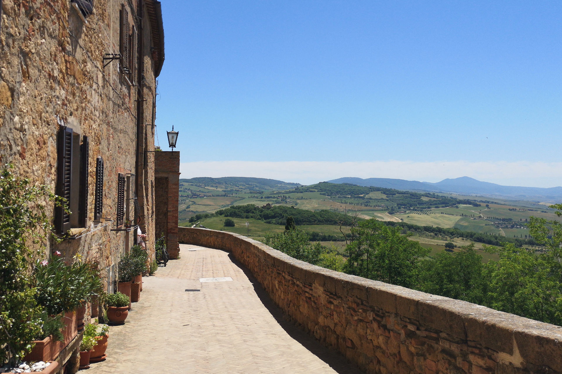 Pienza – Stadtmauer mit Blick auf das Val d’Orcia