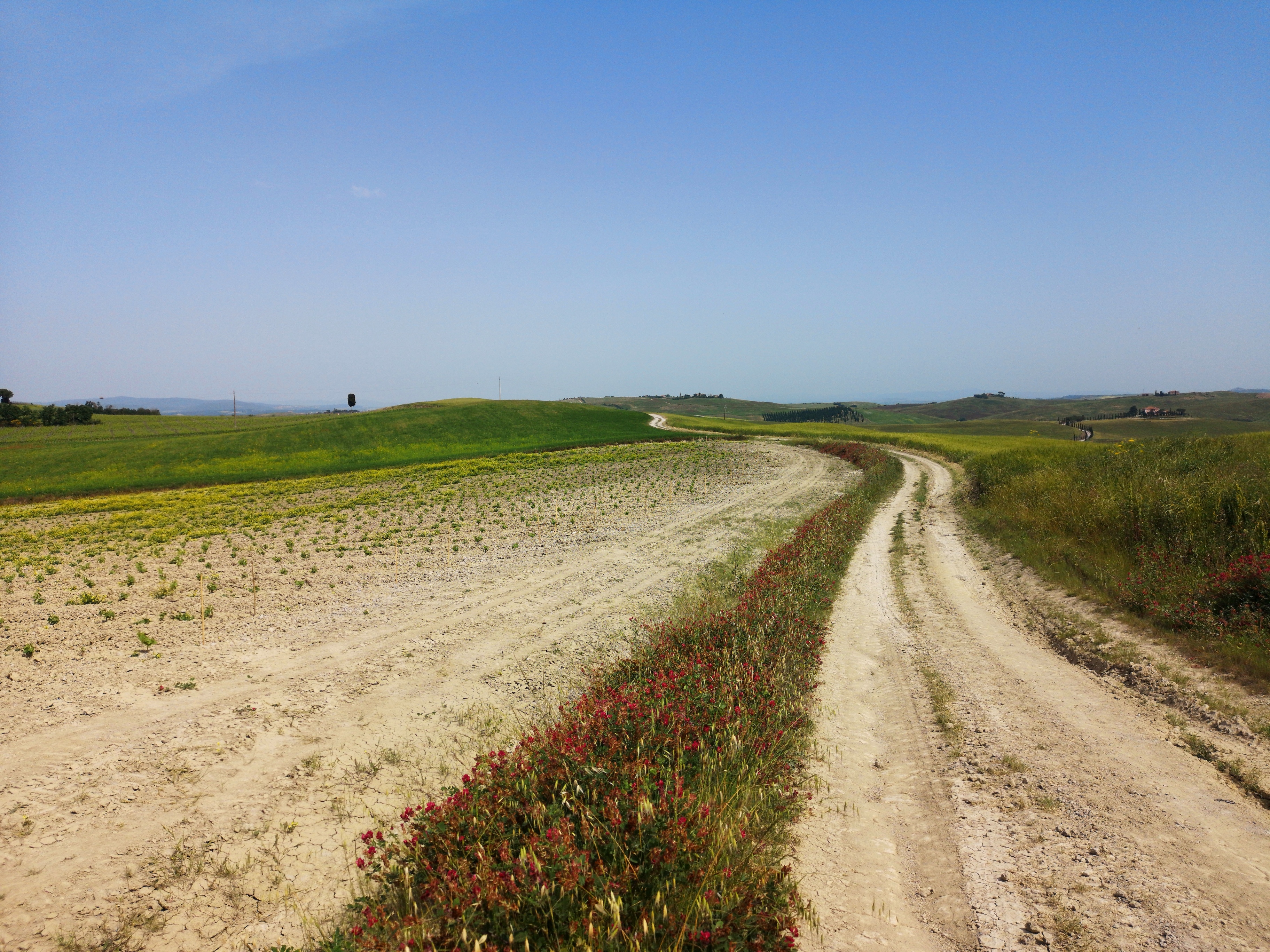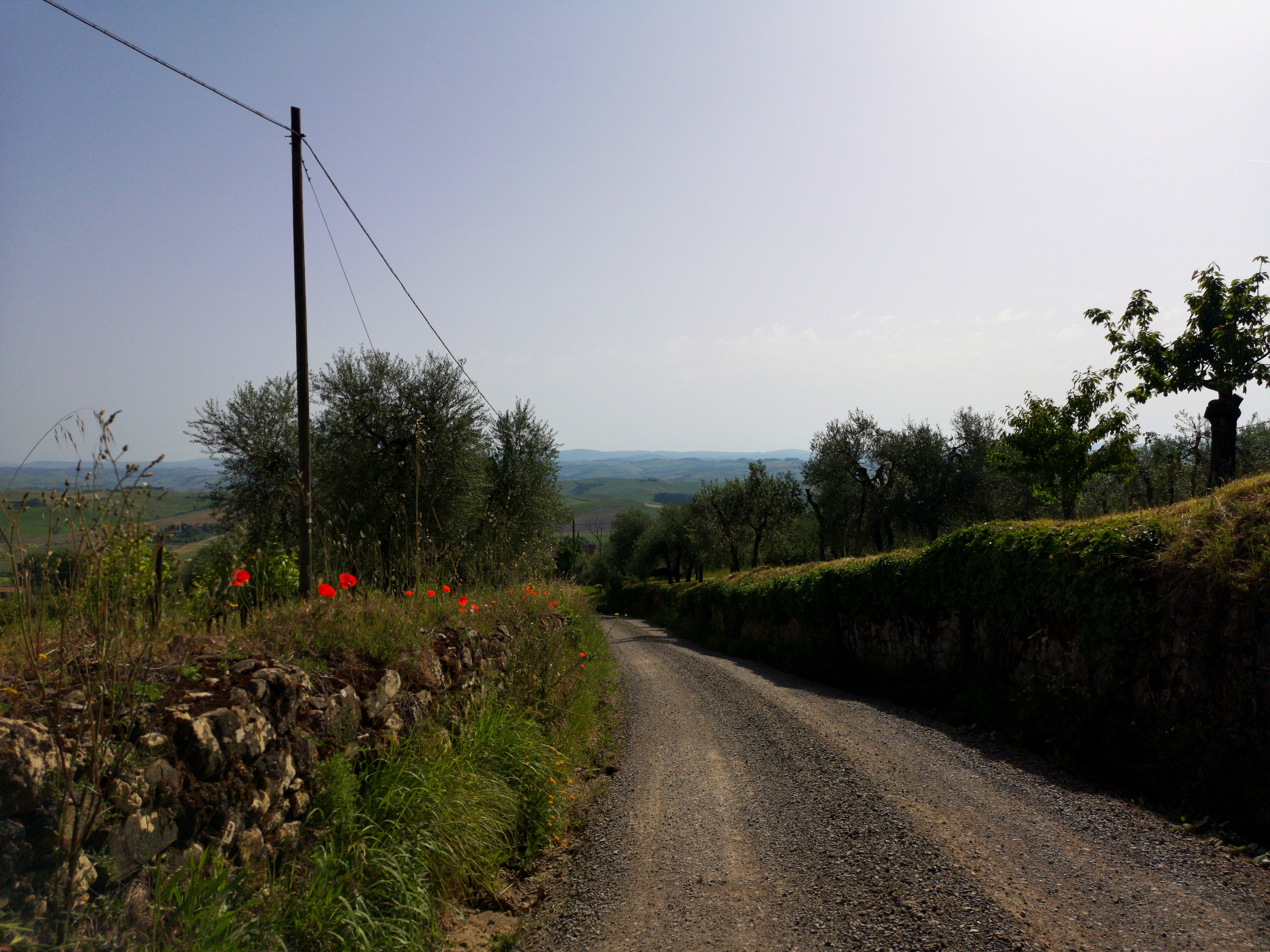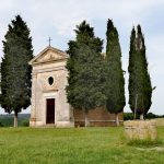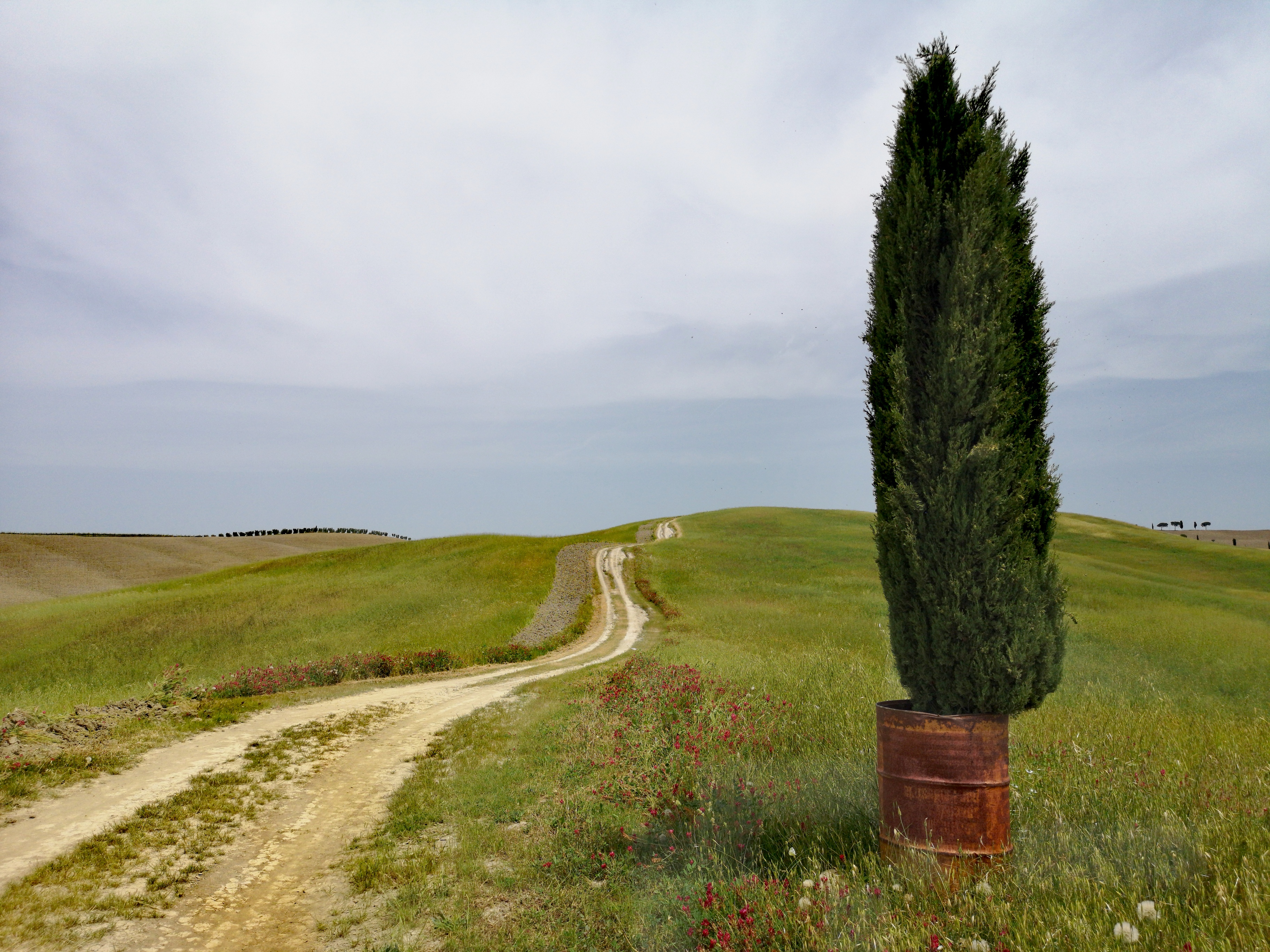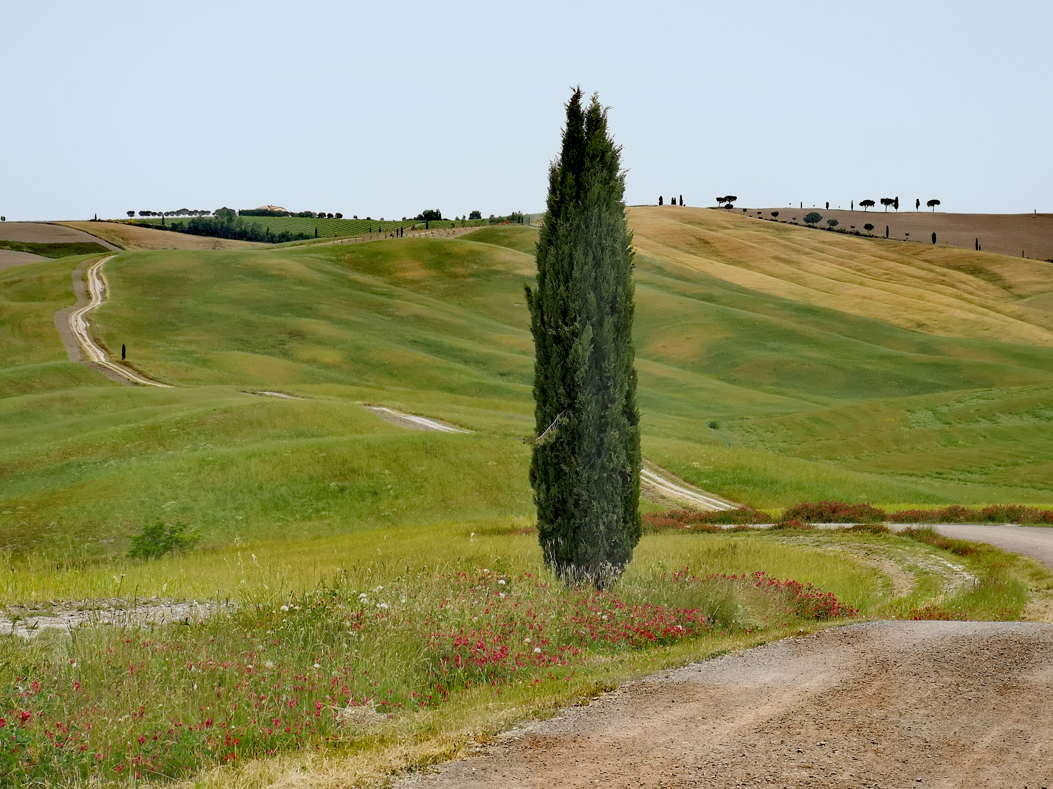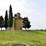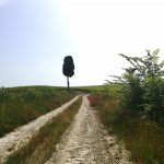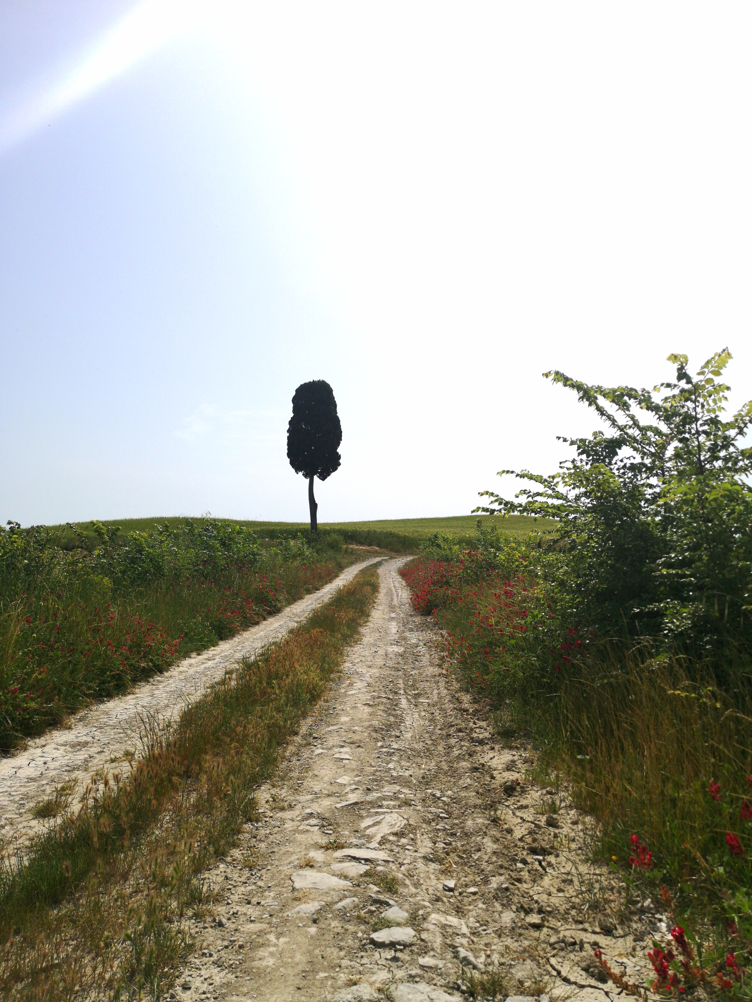 Nachdem ich mich heute Morgen um viertel vor sechs aus dem Bett geschwungen gequält hatte, saß ich kurze Zeit später im Bus 112 nach Torrenieri. Dort bin ich dann einmal umgestiegen und war schon um halb acht in Montalcino. Und was soll ich sagen… außer mir war da um diese Zeit so gut wie niemand. Herrlich, denn Montalcino ist echt schön. Nach einem erneut kleinen und leckeren Frühstück bin ich dann losgezogen. Es war so angenehm, nur drei Liter Wasser, zwei Äpfel und vier gut belegte Brote im Rucksack zu haben. Da bin ich anderes gewohnt. Vielleicht hätte ich aber besser noch zwei Liter mehr zu trinken mitnehmen sollen… so musste ich mittags ungeplant an der Via Cassia „rechts abbiegen“, um in San Quirico d’Orcia Wasser zu kaufen. Bei der Gelegenheit habe ich dann direkt eine große Runde durch den Ort gedreht. San Quirico mag ich sehr… nicht nur wegen der tollen „Pici cacio e pepe“, die ich heute in einer kleinen Trattoria gegessen habe. San Quirico ist so wunderbar einfach und unaufgeregt… was daran liegen mag, dass es hier nicht viele Touristen gibt. Warum auch immer. Wenn man nichts gegen Zypressen hat, muss man die Strecke zwischen San Quirico d‘Orcia und Pienza einfach lieben. Und spätestens an der Capella della Madonna di Vitaleta ist man ergriffen von der einmaligen Landschaft… zumindest geht es mir so. Die letzten (Kilo-)Meter nach Pienza führten dann durch den wahrscheinlich schönsten Teil des Val d’Orcia.