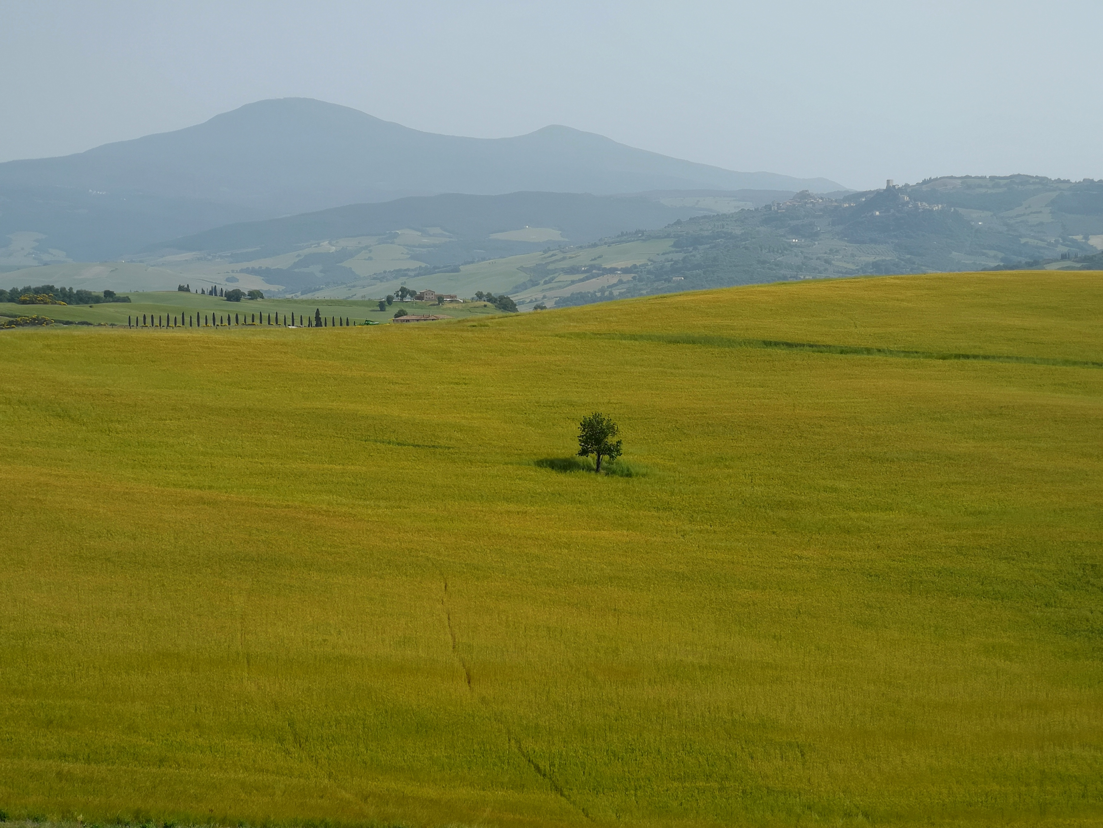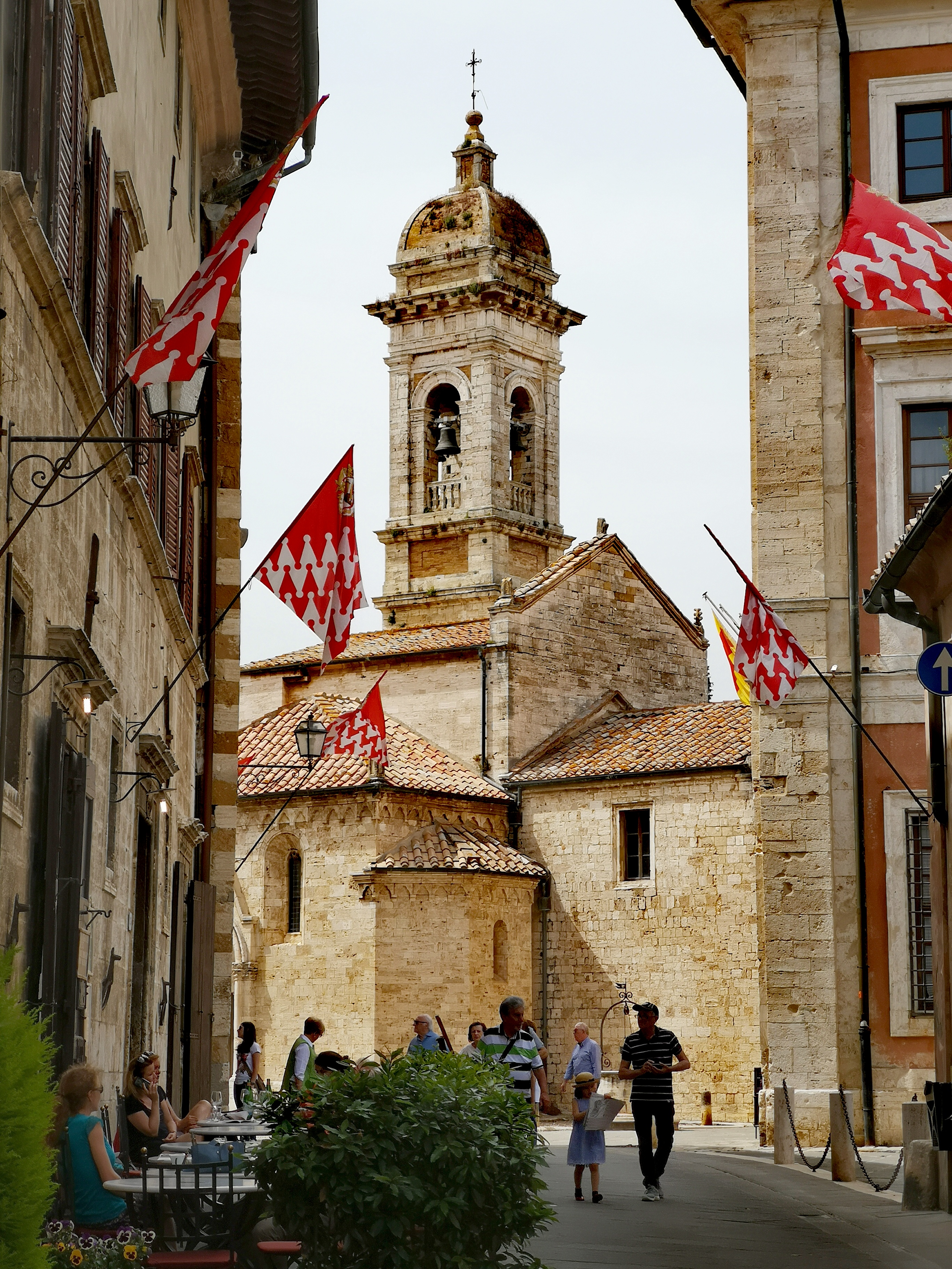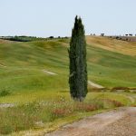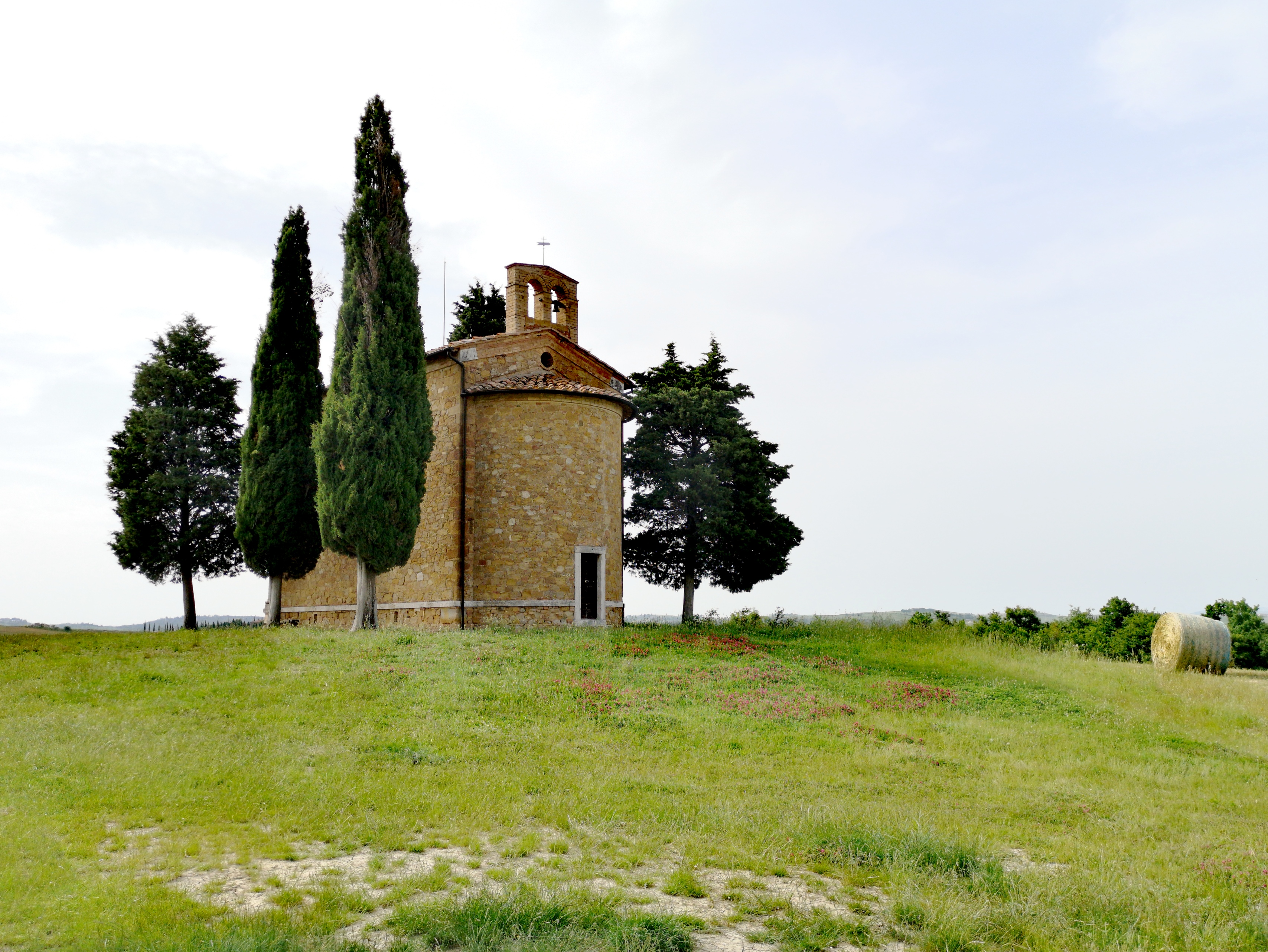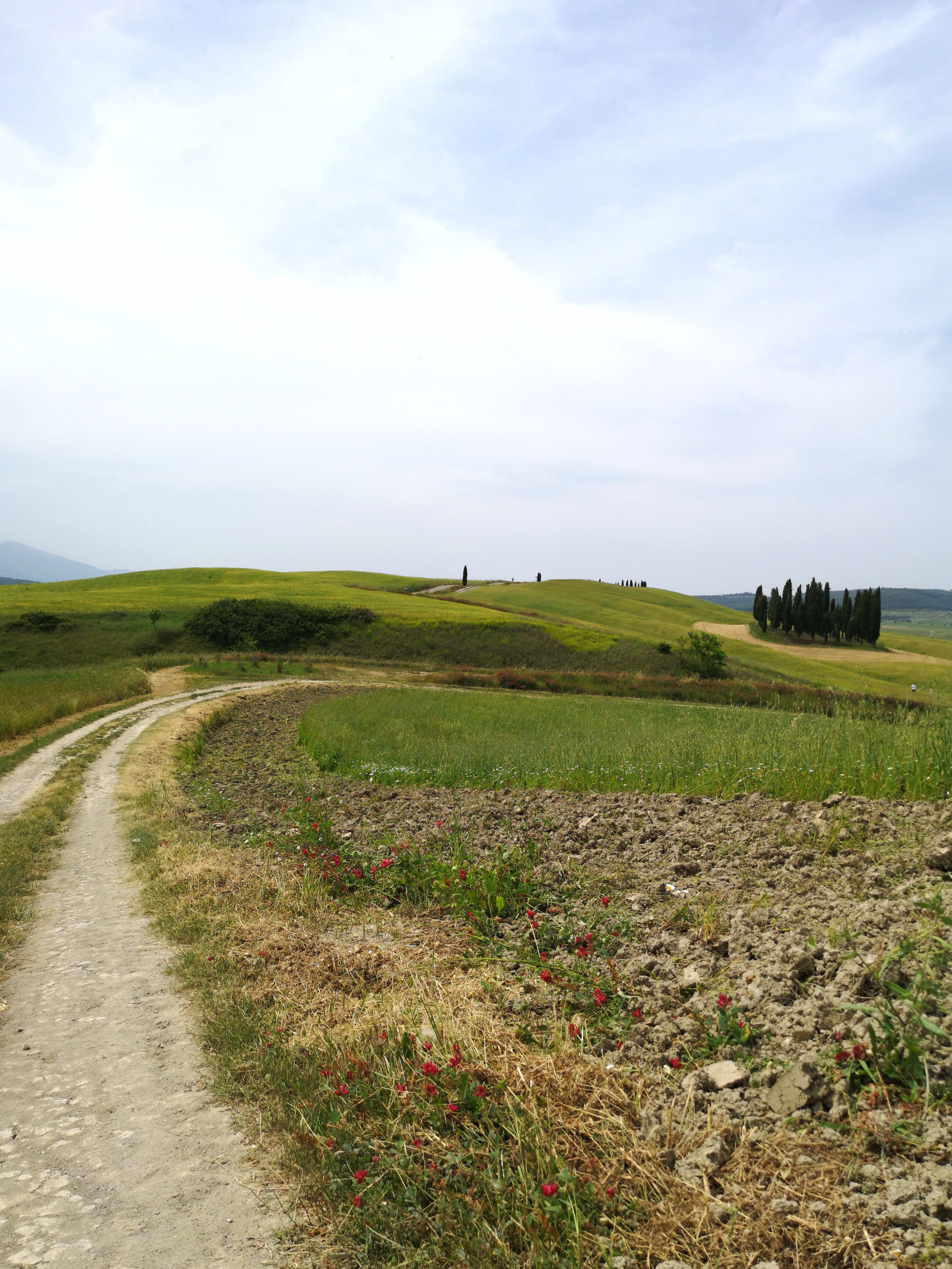 Nachdem ich mich heute Morgen um viertel vor sechs aus dem Bett geschwungen gequält hatte, saß ich kurze Zeit später im Bus 112 nach Torrenieri. Dort bin ich dann einmal umgestiegen und war schon um halb acht in Montalcino. Und was soll ich sagen… außer mir war da um diese Zeit so gut wie niemand. Herrlich, denn Montalcino ist echt schön. Nach einem erneut kleinen und leckeren Frühstück bin ich dann losgezogen. Es war so angenehm, nur drei Liter Wasser, zwei Äpfel und vier gut belegte Brote im Rucksack zu haben. Da bin ich anderes gewohnt. Vielleicht hätte ich aber besser noch zwei Liter mehr zu trinken mitnehmen sollen… so musste ich mittags ungeplant an der Via Cassia „rechts abbiegen“, um in San Quirico d’Orcia Wasser zu kaufen. Bei der Gelegenheit habe ich dann direkt eine große Runde durch den Ort gedreht. San Quirico mag ich sehr… nicht nur wegen der tollen „Pici cacio e pepe“, die ich heute in einer kleinen Trattoria gegessen habe. San Quirico ist so wunderbar einfach und unaufgeregt… was daran liegen mag, dass es hier nicht viele Touristen gibt. Warum auch immer. Wenn man nichts gegen Zypressen hat, muss man die Strecke zwischen San Quirico d‘Orcia und Pienza einfach lieben. Und spätestens an der Capella della Madonna di Vitaleta ist man ergriffen von der einmaligen Landschaft… zumindest geht es mir so. Die letzten (Kilo-)Meter nach Pienza führten dann durch den wahrscheinlich schönsten Teil des Val d’Orcia.