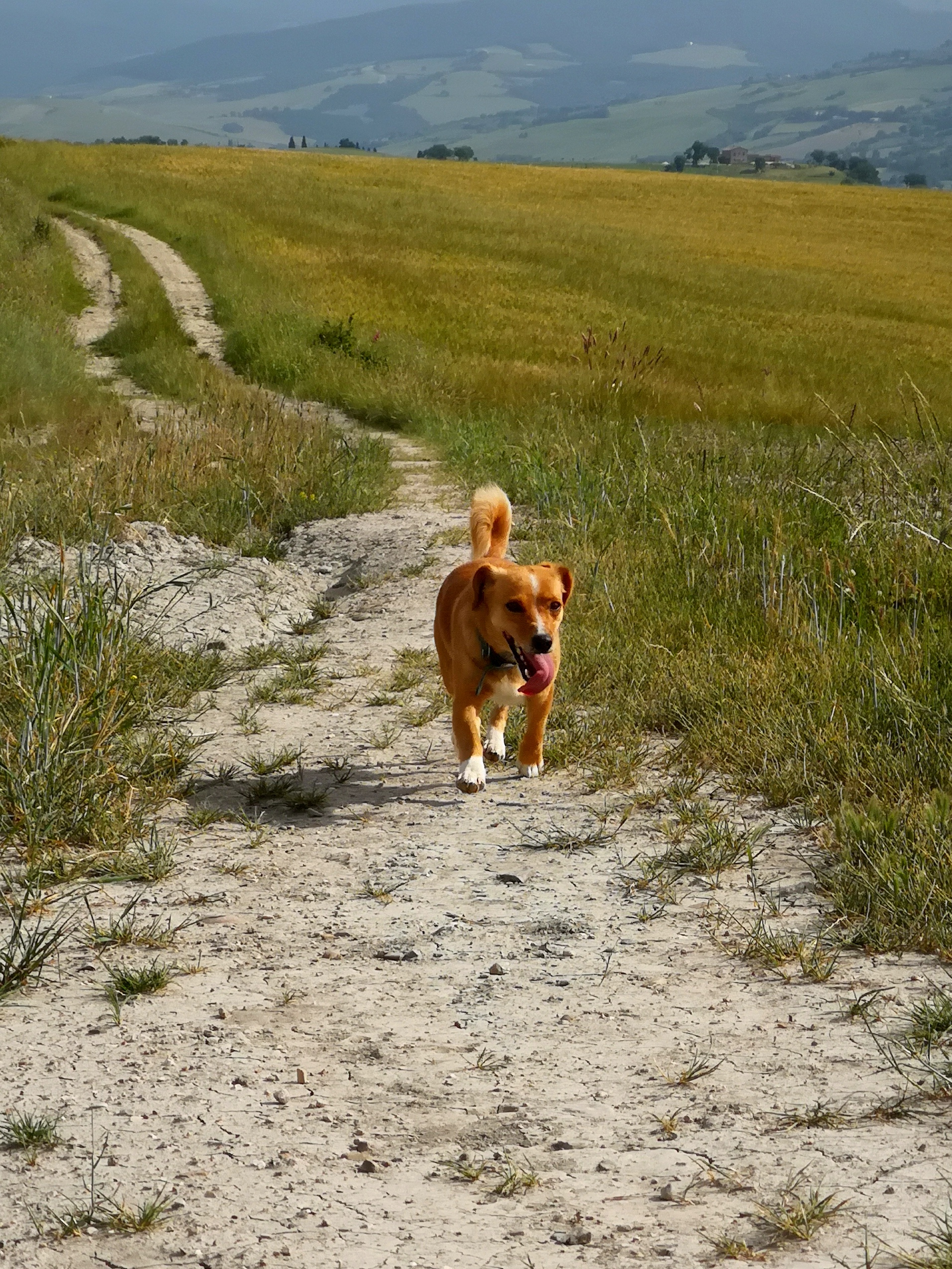 Ich muss sehen, dass ich zum Ende komme, ich werde langsam doch ziemlich müde. Noch zwei nette Geschichten von unterwegs. Zum einen ist mir heute, zum ersten Mal nach fast 1000 Kilometern zu Fuß durch die Toskana, eine große Eidechse von vorne kommend zwischen meinen Beinen durch geflitzt. Ich weiß nicht, wer sich dabei mehr erschrocken hat. Zum anderen bin ich wieder einem „unbekannten Hund“ begegnet. Diesmal war er aber eine Nummer kleiner und auch recht schnell wieder verschwunden.