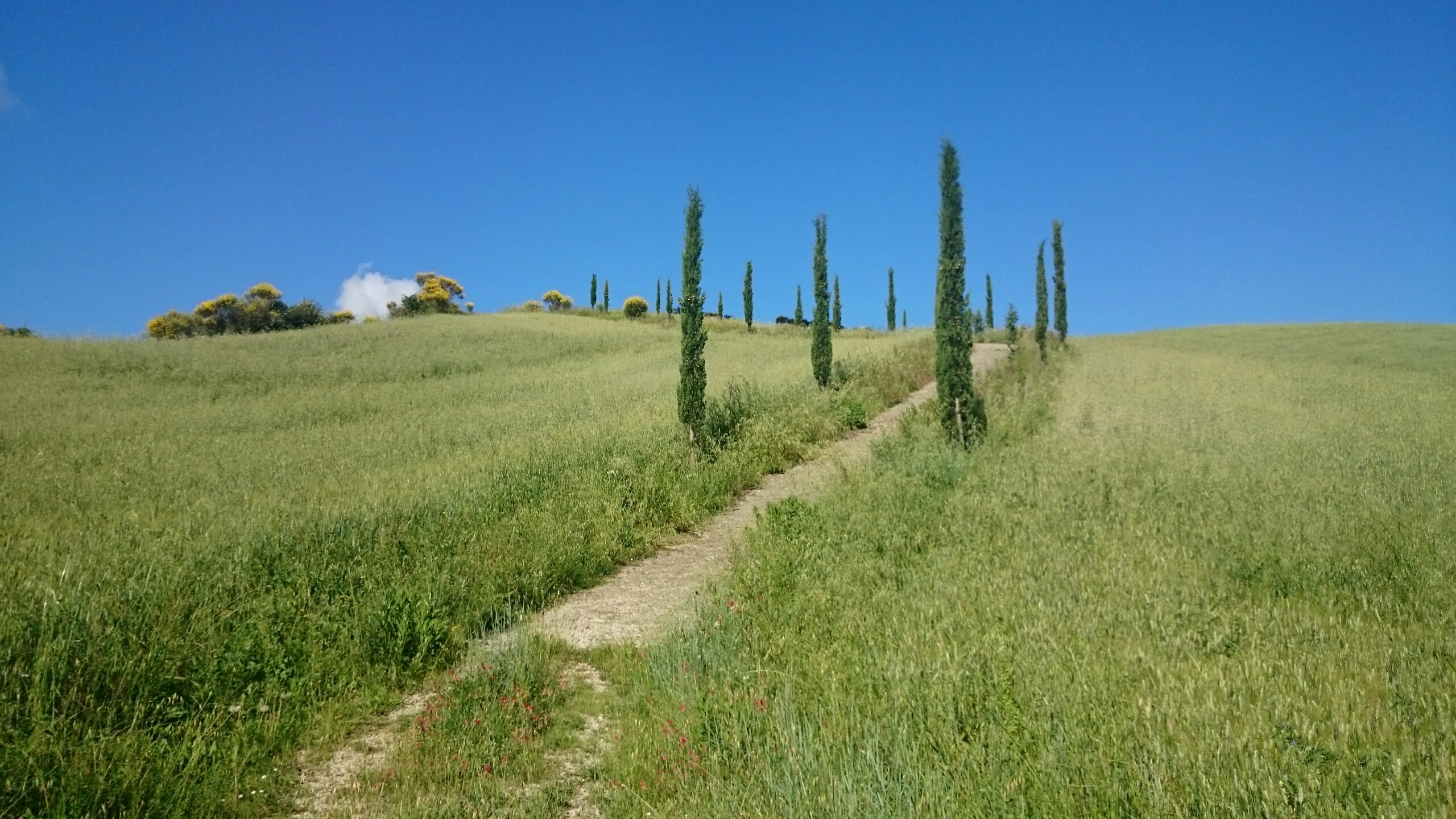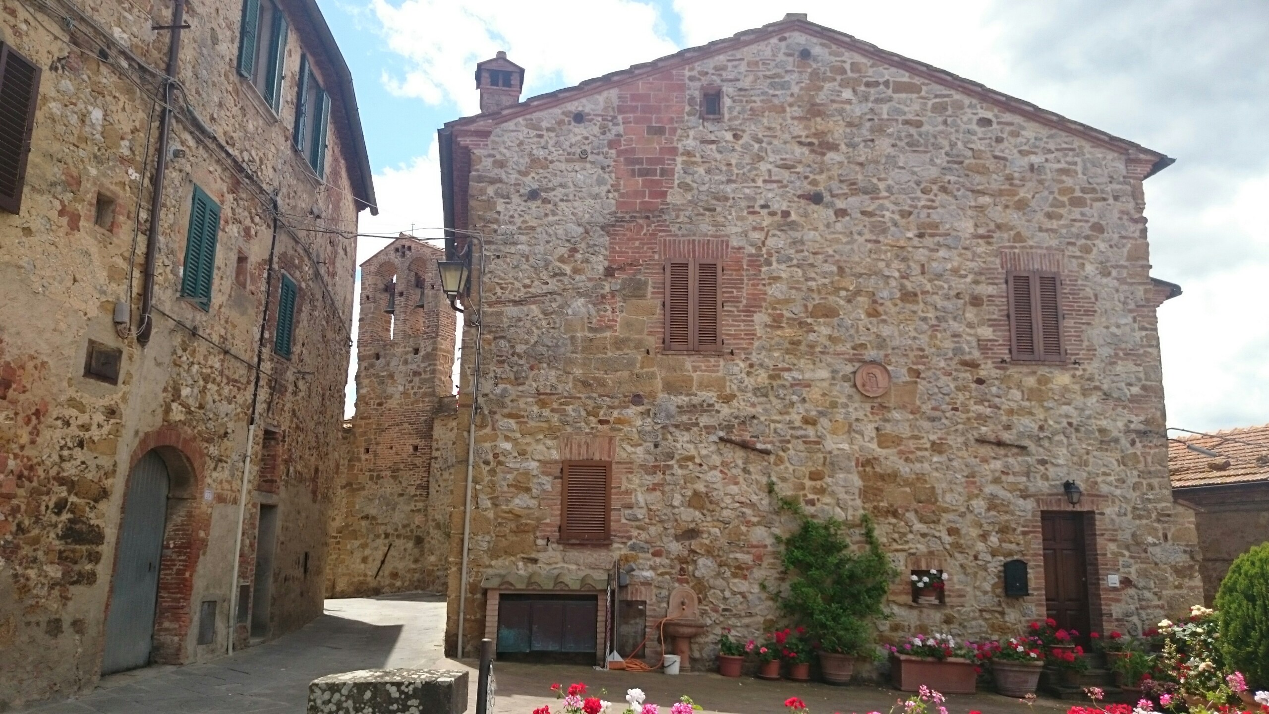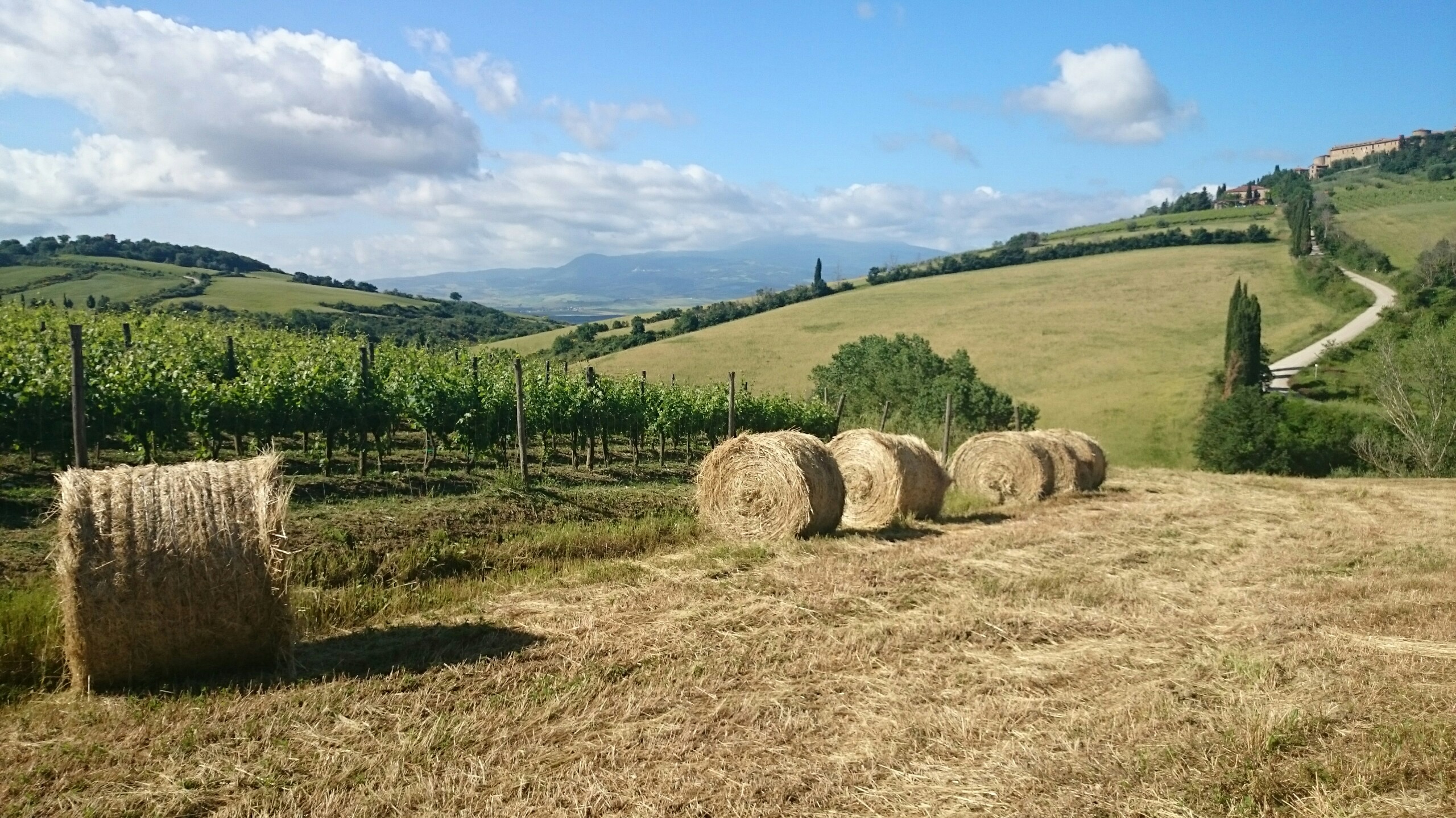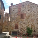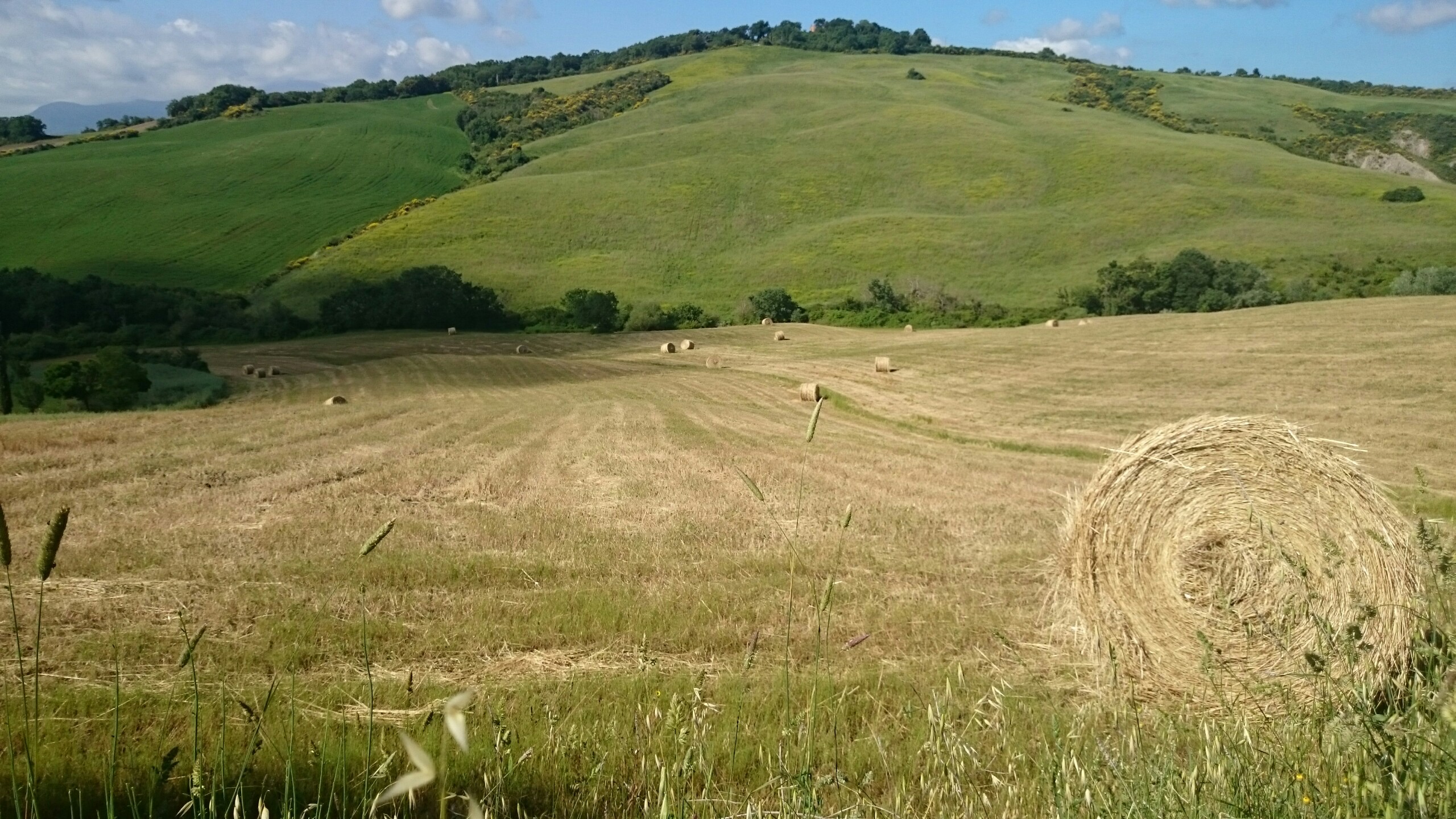 Wie gut, dass ich heute Nachmittag trotz Rucksack noch ein bisschen beschleunigen konnte. So sitze ich jetzt hier in meiner Unterkunft und werde nur von innen nass. Keine fünf Minuten nach meiner Ankunft in Castelmuzio fing es nämlich heftig an zu regnen. Dazu sage ich nur „che fortuna“… und meine damit nicht etwa Düsseldorf. Heute Morgen bin ich bei strahlendem Sonnenschein in Pienza aufgebrochen und obwohl diese Etappe nicht so spektakulär wie der gestrige Abschnitt war, hat mir der Weg hierher und vor allem der kleine „steinalte“ Ort Petroio sehr gefallen. Und so kitschig diese toskanischen Heuballen auch sein mögen, irgendwie sehe ich sie hier gern überall herumliegen. Meine Unterkunft in Castelmuzio ist diesmal übrigens ein alter Gasthof mit toller Küche und richtig gemütlicher Atmosphäre.