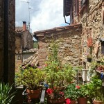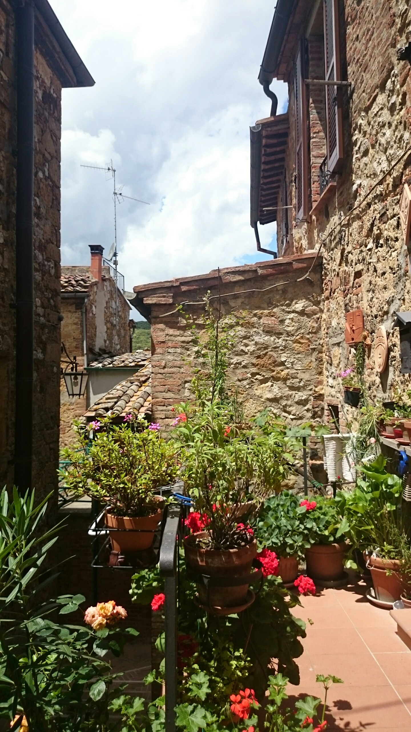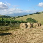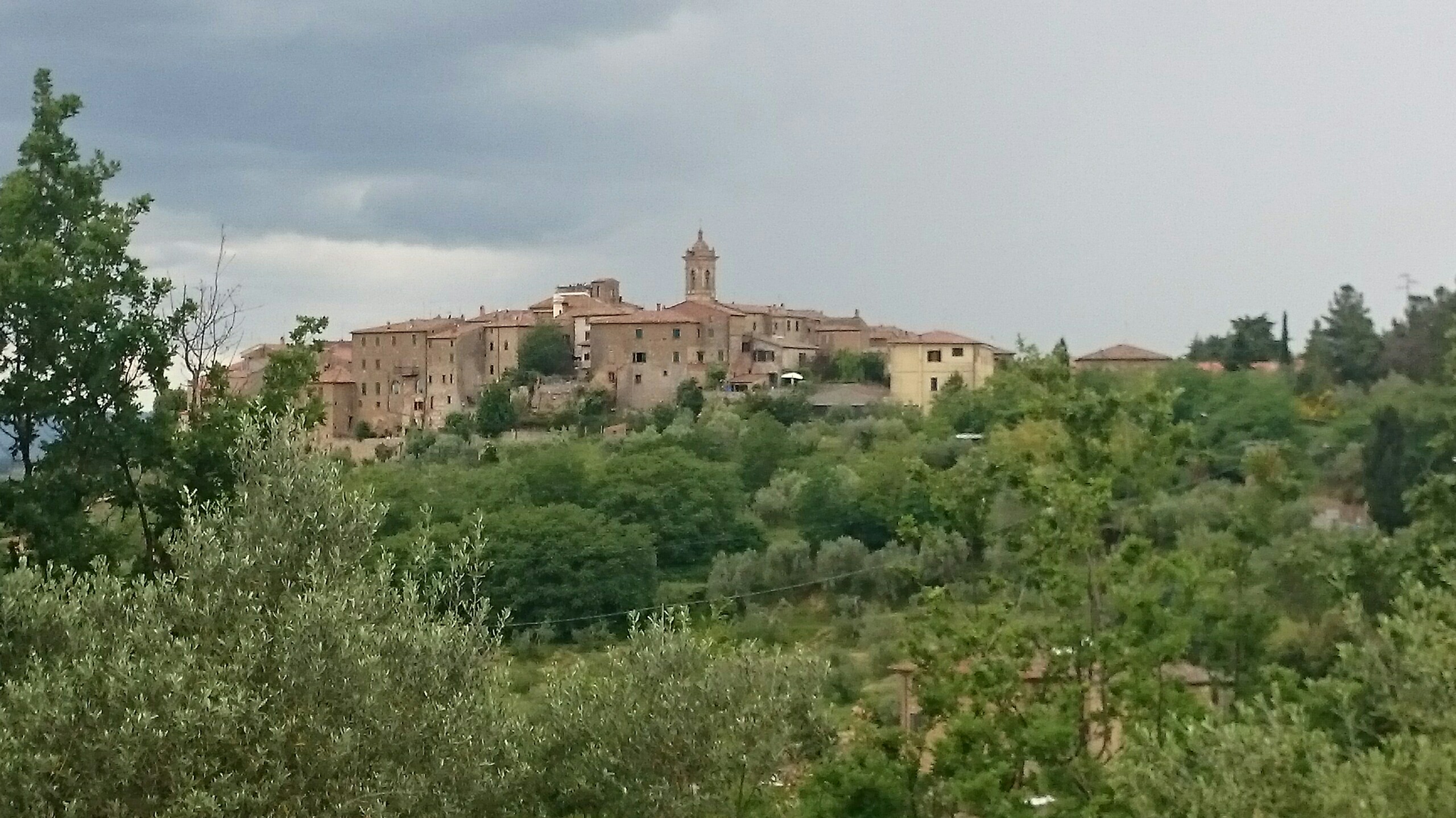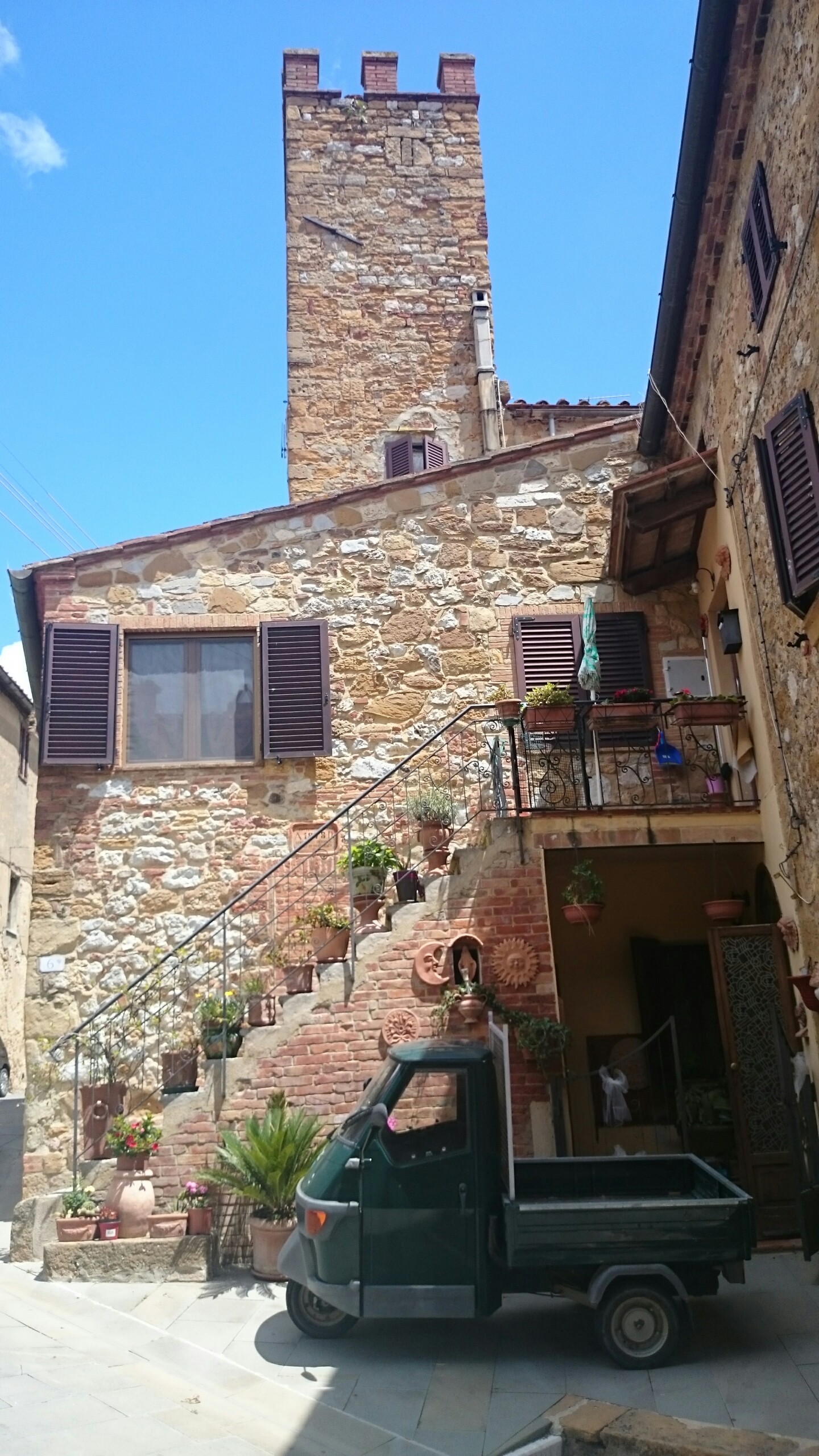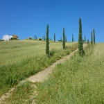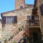 Wie gut, dass ich heute Nachmittag trotz Rucksack noch ein bisschen beschleunigen konnte. So sitze ich jetzt hier in meiner Unterkunft und werde nur von innen nass. Keine fünf Minuten nach meiner Ankunft in Castelmuzio fing es nämlich heftig an zu regnen. Dazu sage ich nur „che fortuna“… und meine damit nicht etwa Düsseldorf. Heute Morgen bin ich bei strahlendem Sonnenschein in Pienza aufgebrochen und obwohl diese Etappe nicht so spektakulär wie der gestrige Abschnitt war, hat mir der Weg hierher und vor allem der kleine „steinalte“ Ort Petroio sehr gefallen. Und so kitschig diese toskanischen Heuballen auch sein mögen, irgendwie sehe ich sie hier gern überall herumliegen. Meine Unterkunft in Castelmuzio ist diesmal übrigens ein alter Gasthof mit toller Küche und richtig gemütlicher Atmosphäre.