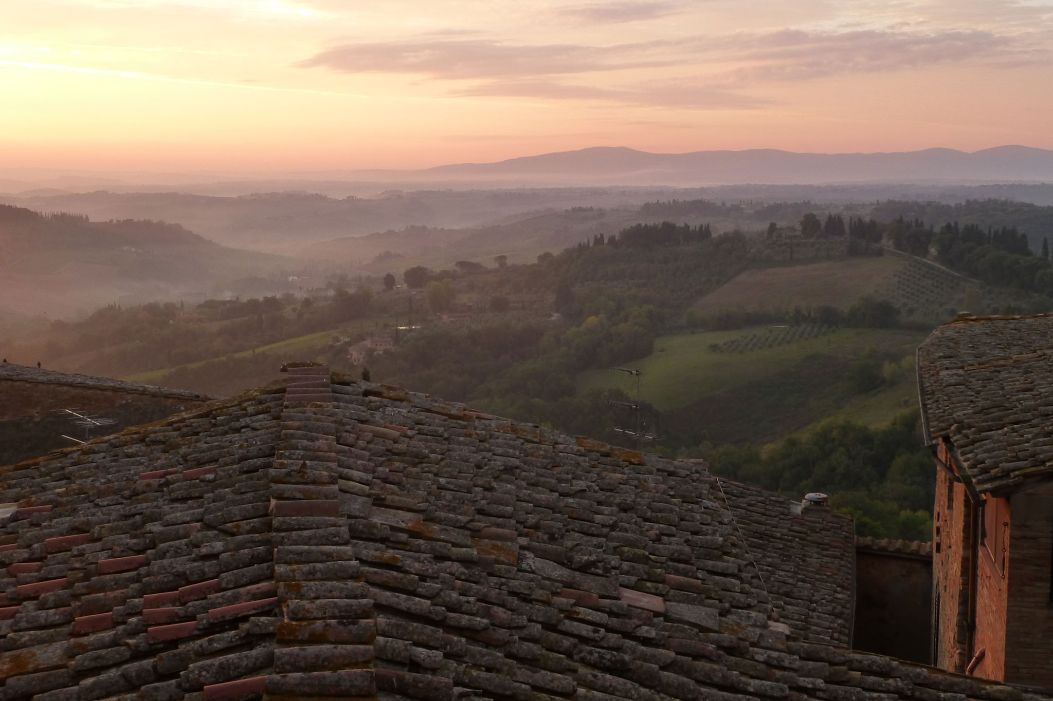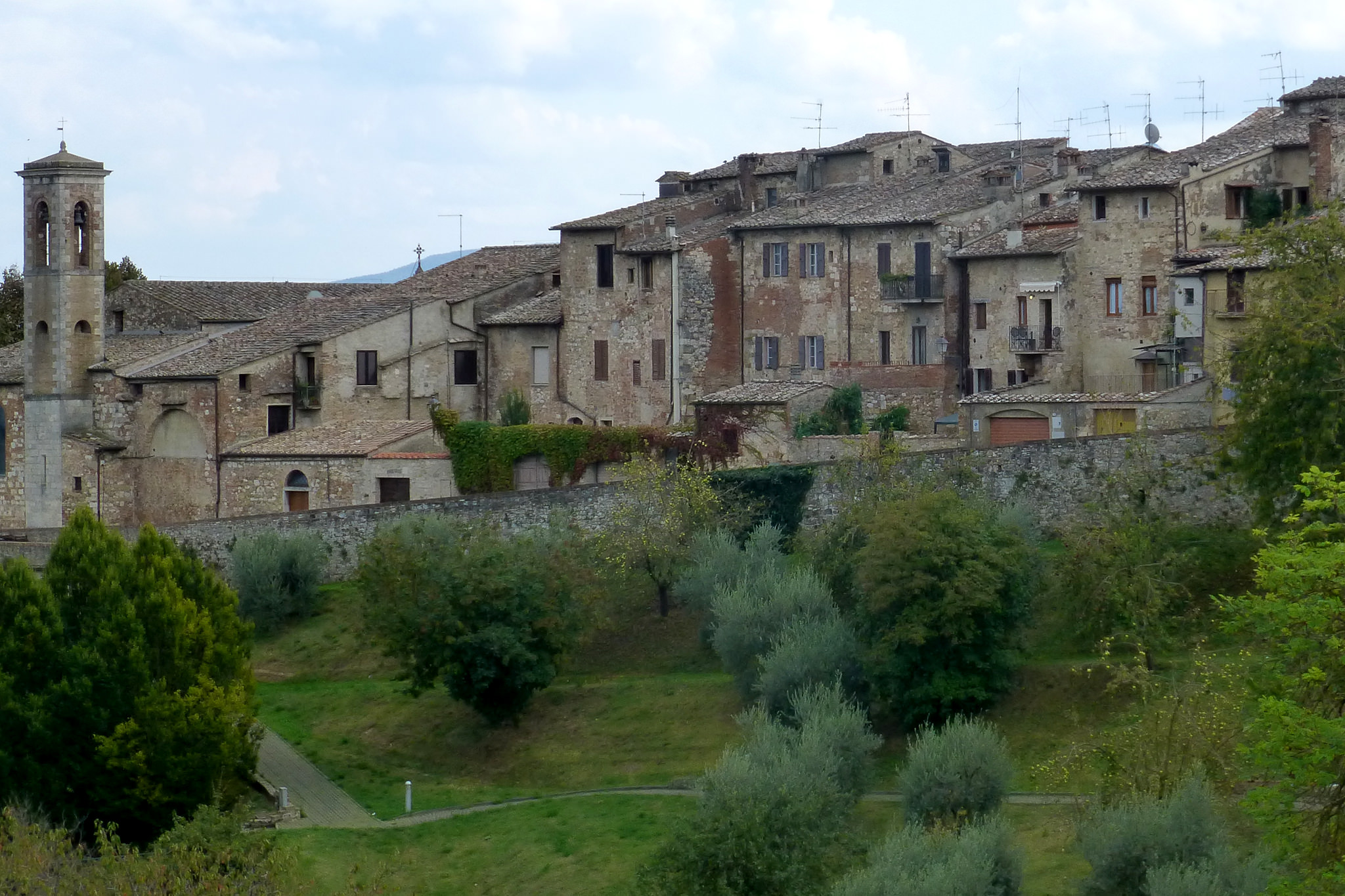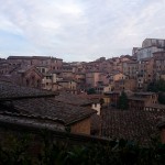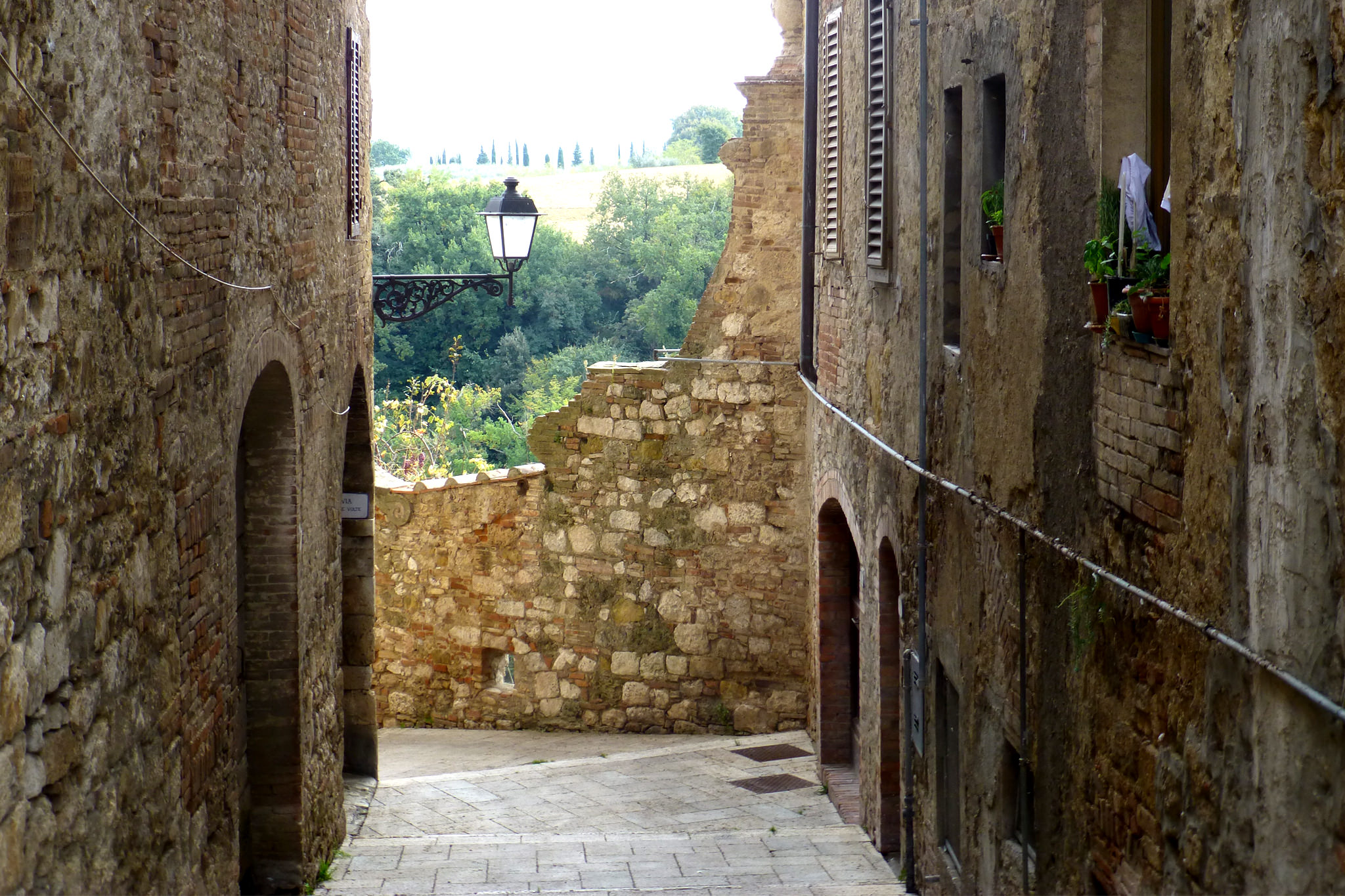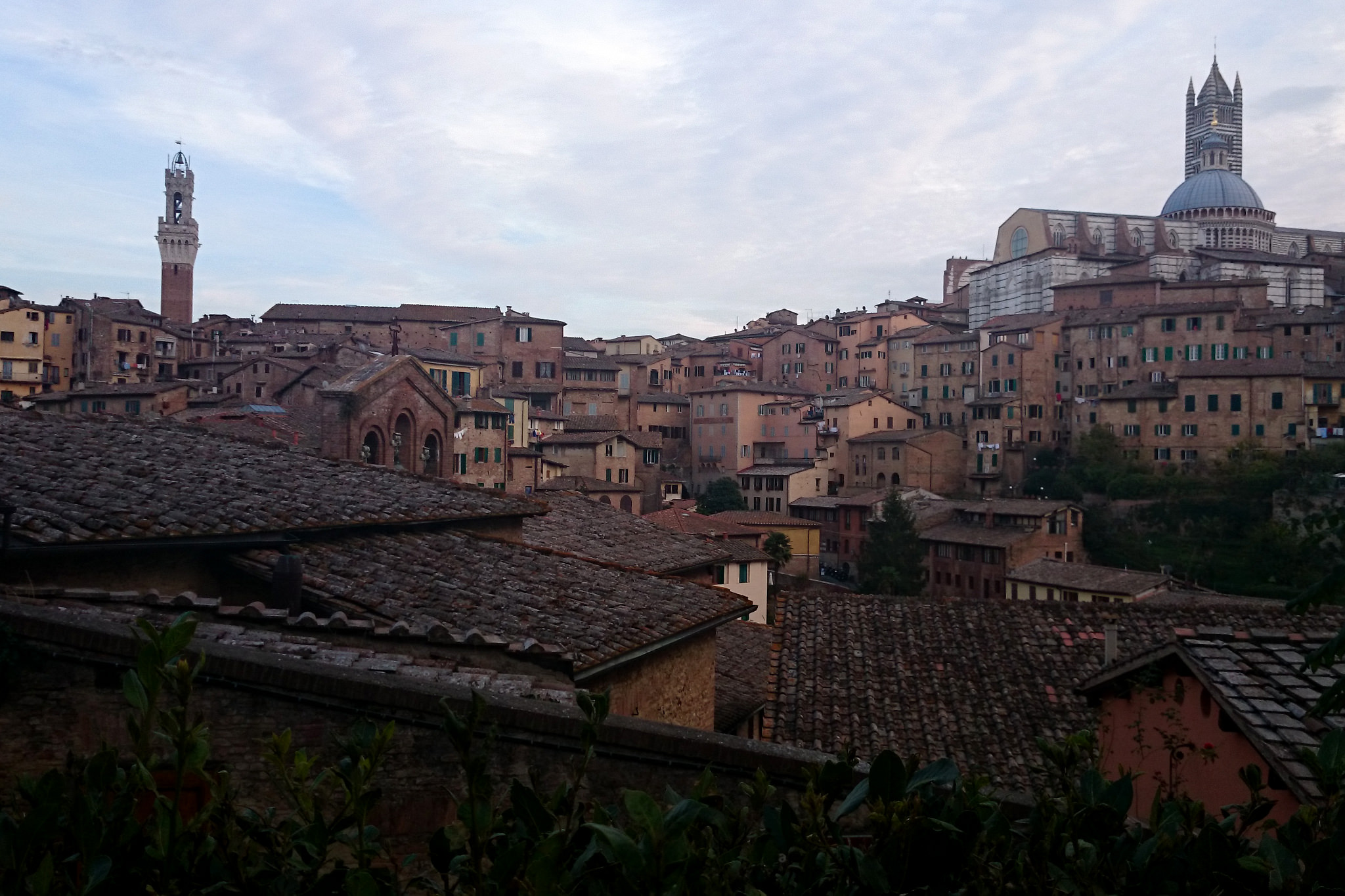 Ich sitze in Siena am Piazza del Campo und lasse die Seele und die Füße baumeln. Letztere wollen heute partout nicht mehr weiter… zum Glück ist meine Unterkunft keine 100 Meter von hier entfernt. Meine eigentliche Etappe führte heute von San Gimignano über Monte Oliveto und Montauto nach Colle di Val d’Elsa. Die insgesamt rund 21 Kilometer bin ich meistens über freundliche Wege gegangen… bis auf die 50 Meter, die ich von einem großen, freilaufenden und knurrendem Hund eskortiert wurde. Wahrscheinlich roch ich aber nicht genug nach kleinem Wildschwein, denn er beließ es zum Glück beim Knurren und drehte irgendwann wieder um. Obwohl ich meine Klamotten jeden Tag von Hand wasche und im Wechsel trage, habe ich anscheinend schon besser gerochen. Die anschließende Strecke hinter Montauto verlief relativ unspektakulär… bis ich nach einer Kurve plötzlich einen kleinen Bach überqueren durfte und auf eine wild zugewucherte Wiese zulief. Dort standen nur wenige Meter vor mir drei große Rehe. Bevor ich Foto machen konnte waren die Tiere natürlich längst im Wald verschwunden. Mein Weg war dummerweise aber auch weg… Weg weg. (Das kleine Wortspiel gefällt mir gerade… ich sollte keinen Wein mehr bestellen.) Auf jeden Fall habe ich eine ganze Weile fassungslos nach diesem Weg gesucht und ich sah mich schon einen großen Teil der Strecke wieder zurückgehen. Doch dann, kurz bevor ich umkehren wollte, entdeckte ich fast an der gleichen Stelle, an der die Rehe verschwunden waren, eine kleine Öffnung im Wald… und dahinter meinen Weg nach Colle di Val d’Elsa. Als ich die Stadt dann am frühen Nachmittag erreichte, war ich angenehm überrascht. Die Altstadt, die auf einem Berg liegt, hat ihren Namen wirklich verdient. Ich glaube, ich habe noch keine ältere Stadt gesehen… wirklich sehr schön. Ich bin dann, nach einem kurzen Rundgang, mit einem klapprigen Fahrstuhl in die sogenannte „Unterstadt“ gefahren. Diese war zwar weniger ansprechend, aber von dort aus fuhr mein Bus nach Siena.