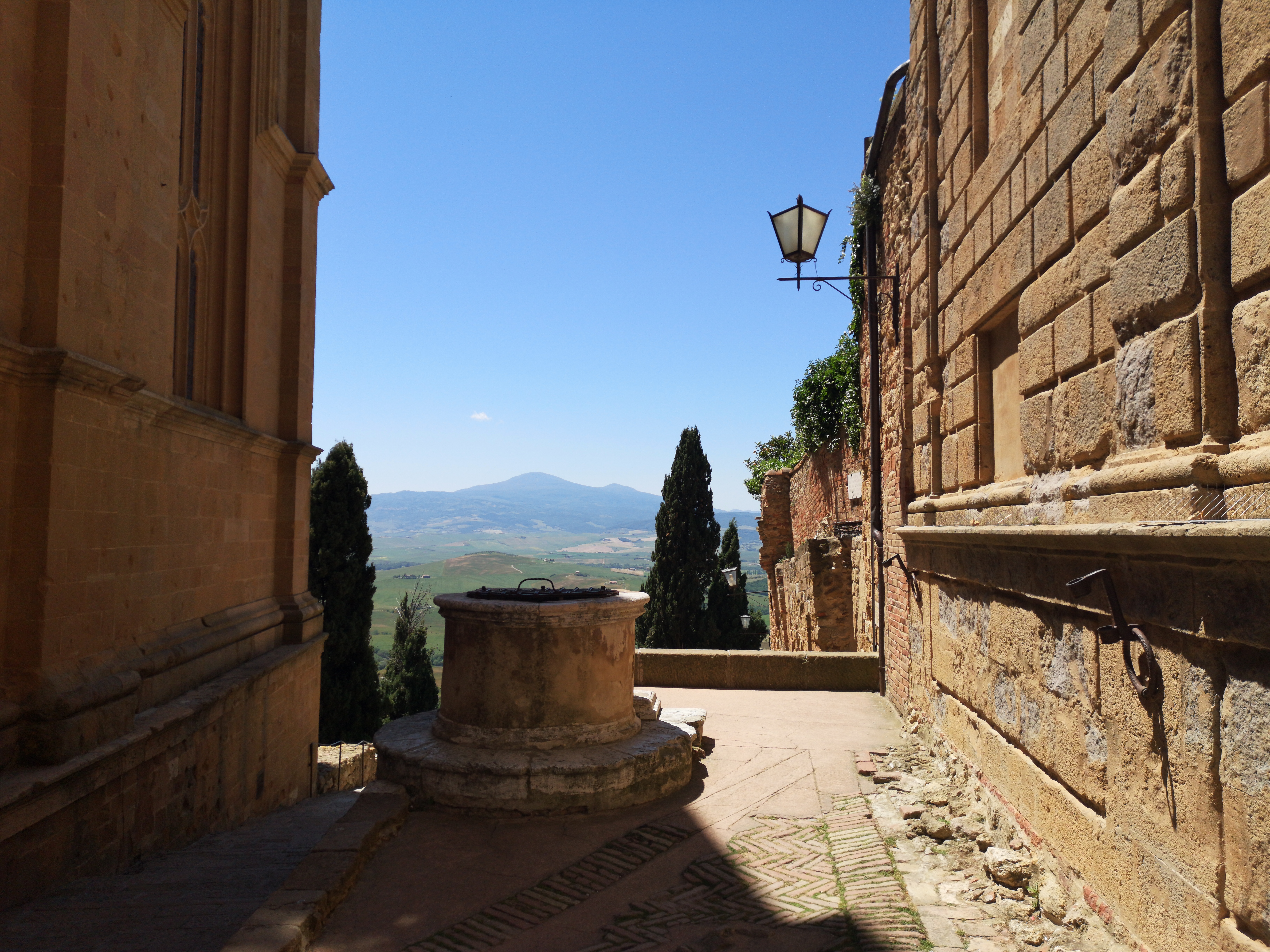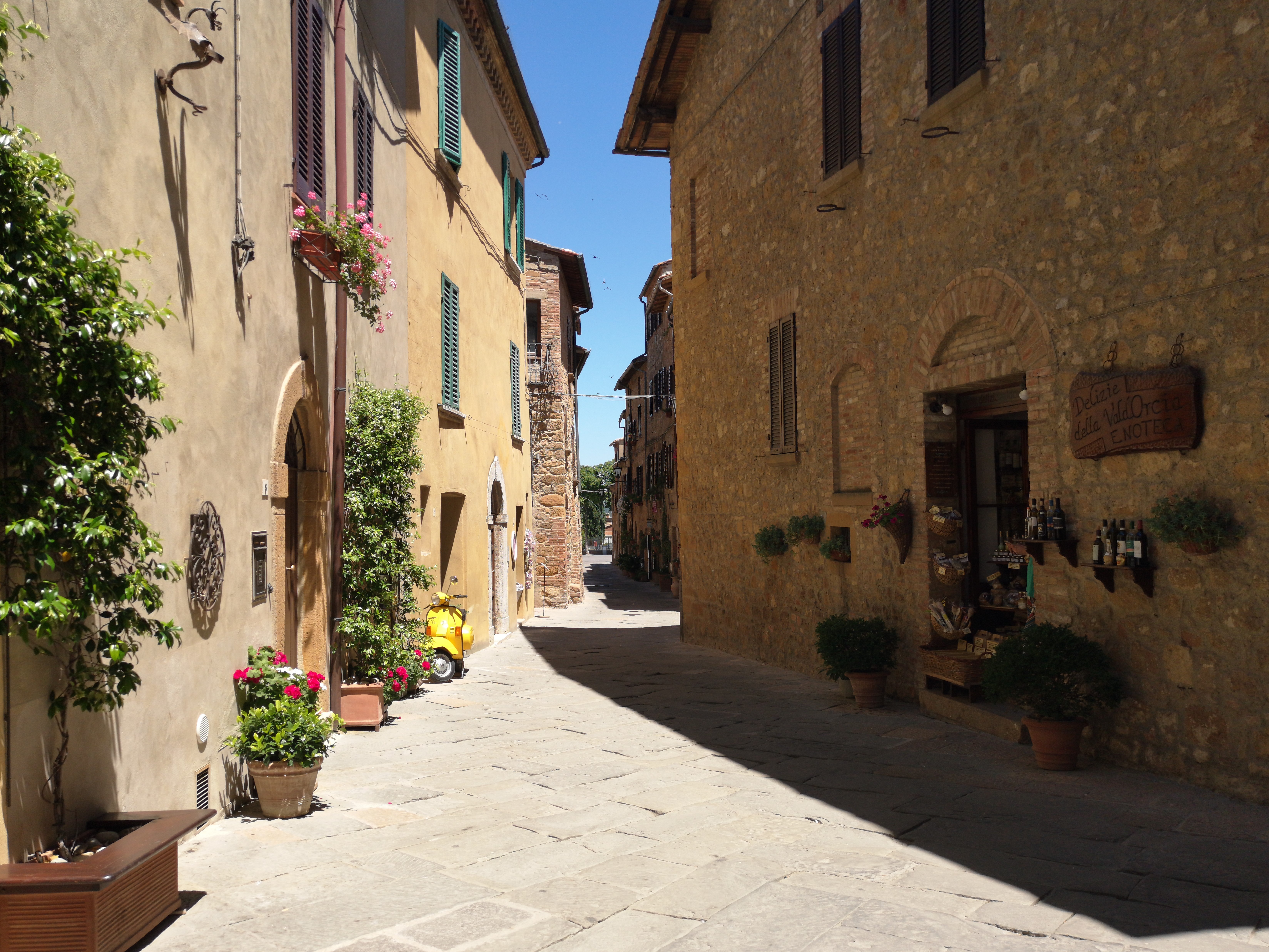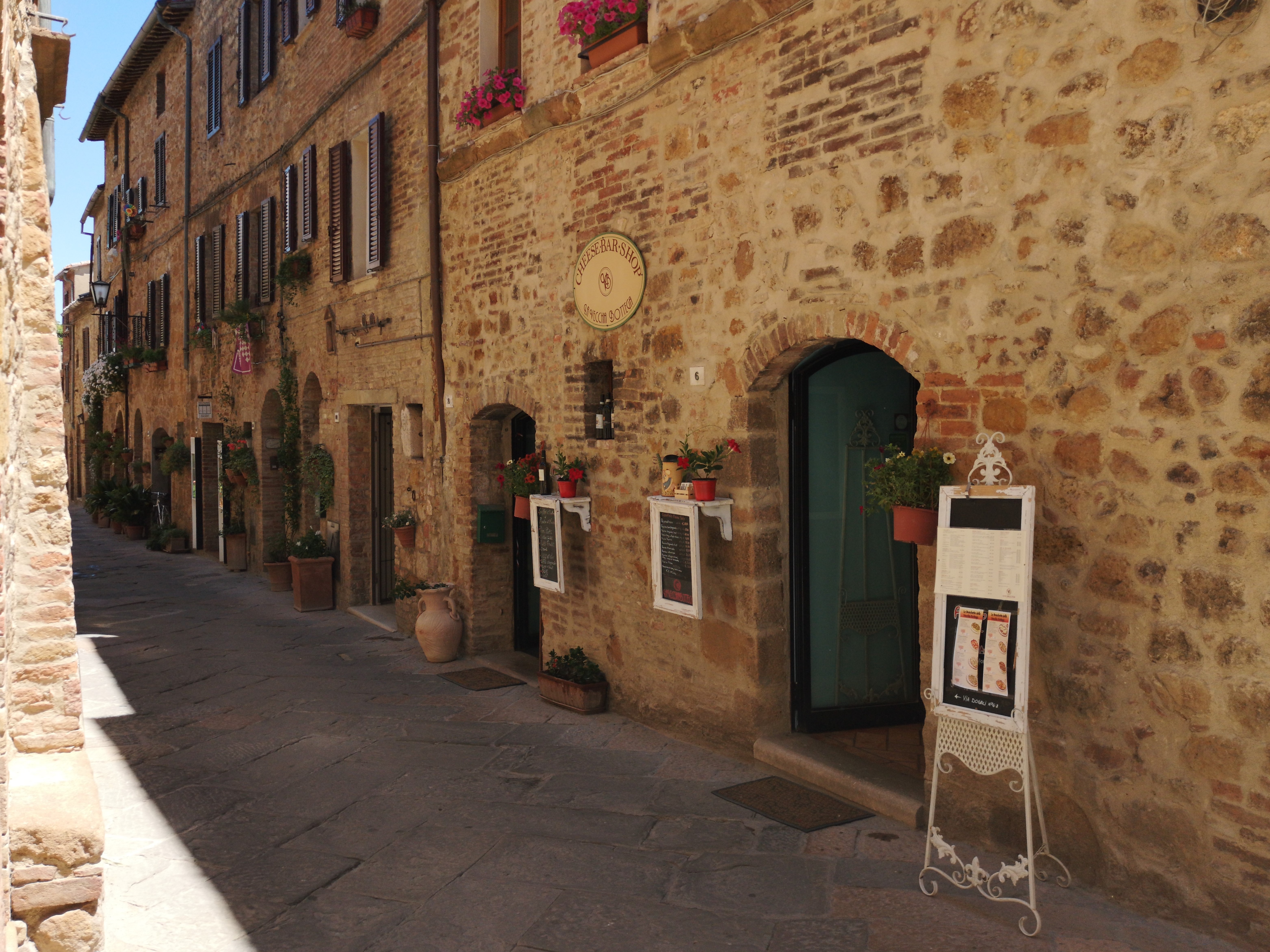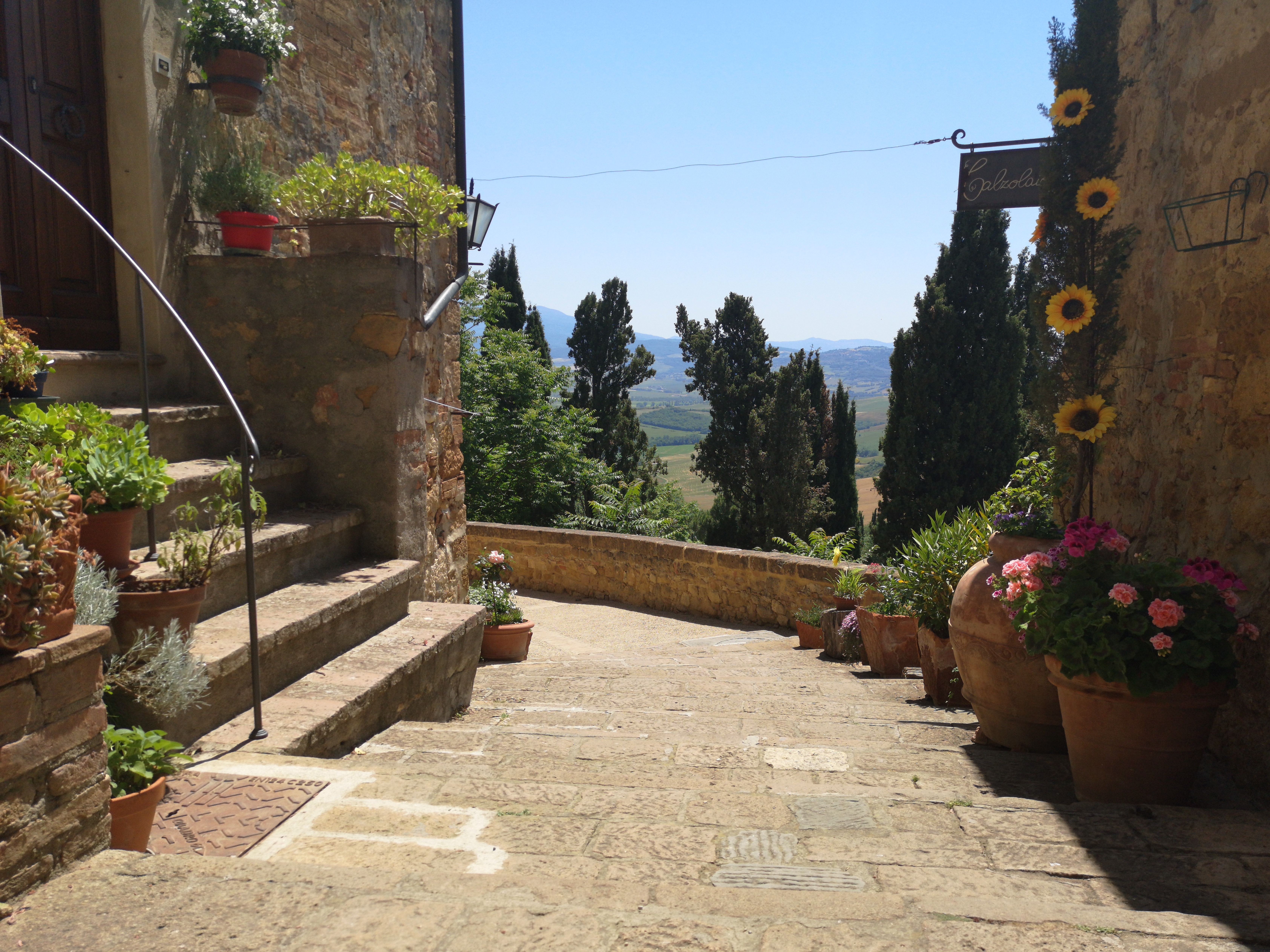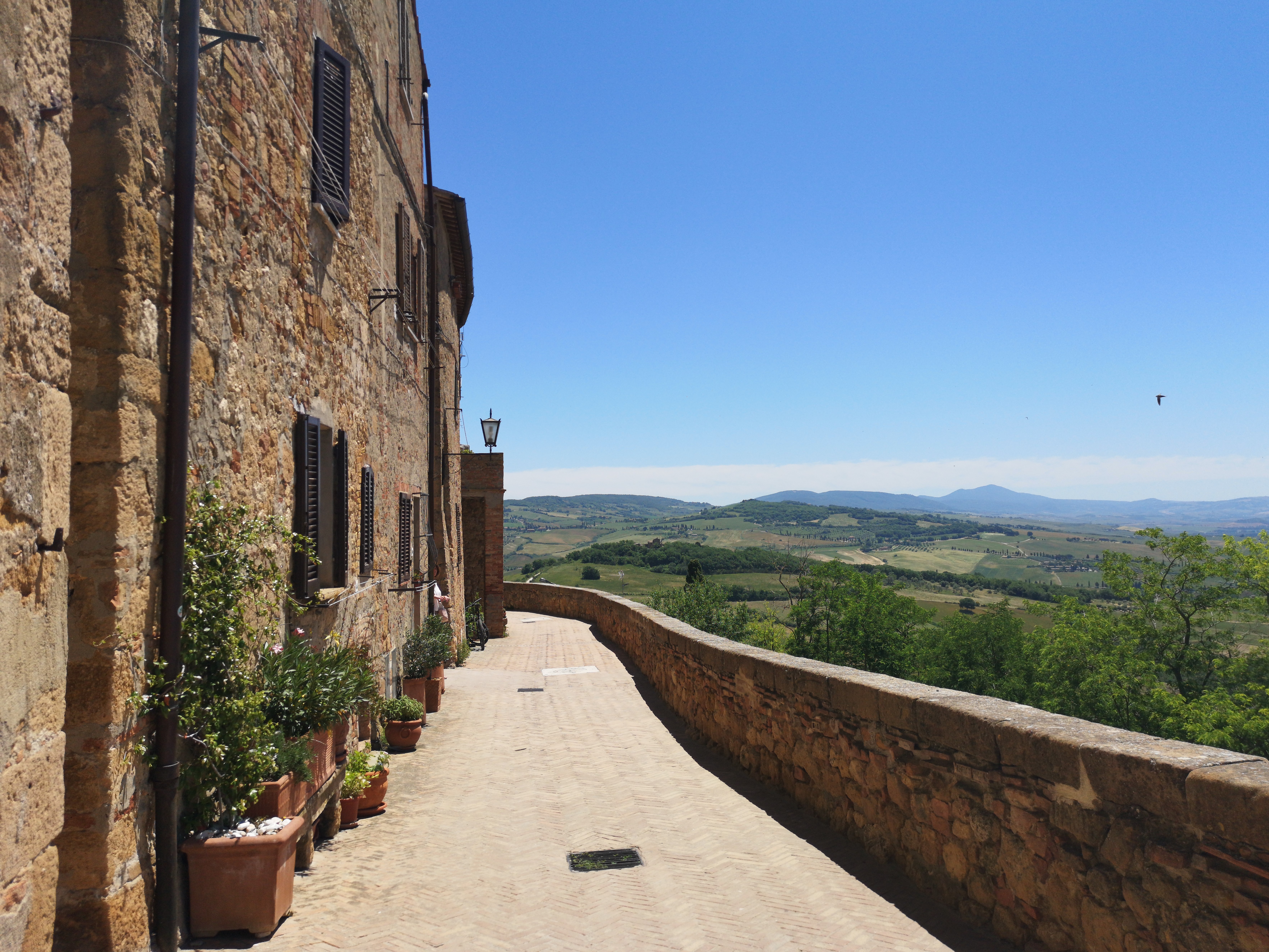 Leicht humpelnd bin ich dann in der Morgendämmerung hinab ins Tal marschiert. Auch wenn ein richtiger Fotograf aus der Stimmung und dem Licht am Morgen mehr „rausgeholt“ hätte… es war schon sehr beeindruckend, zu erleben, wie die Sonne langsam hinter Pienza aufging. Meine Fotos können das alles nur bedingt wiedergeben. Allein die Geräusche der verschiedensten Tiere von den umliegenden Bauernhöfen waren zu hören, sonst nichts. Das Reh im Wald und der verdammt große Hase, der mir über den Weg lief, waren beide zu schnell für meine Kamera. Aber sie machten den Morgen für mich rund. Um kurz nach sieben war ich dann wieder zurück und habe mich nochmal hingelegt. Gegen Mittag waren meine mittlerweile wieder 10 Zehen und ich dann bereit für eine entspannte Runde durch Pienza. Auch wenn ich hier vieles schon gesehen habe, war es schön, „ausgeruht“ ein wenig durch die Gassen zu bummeln. Ich bin ganz zuversichtlich, dass meine Füße morgen wieder in meine Wanderschuhe passen und ich zumindest eine kleine Etappe „wohin auch immer“ gehen kann.