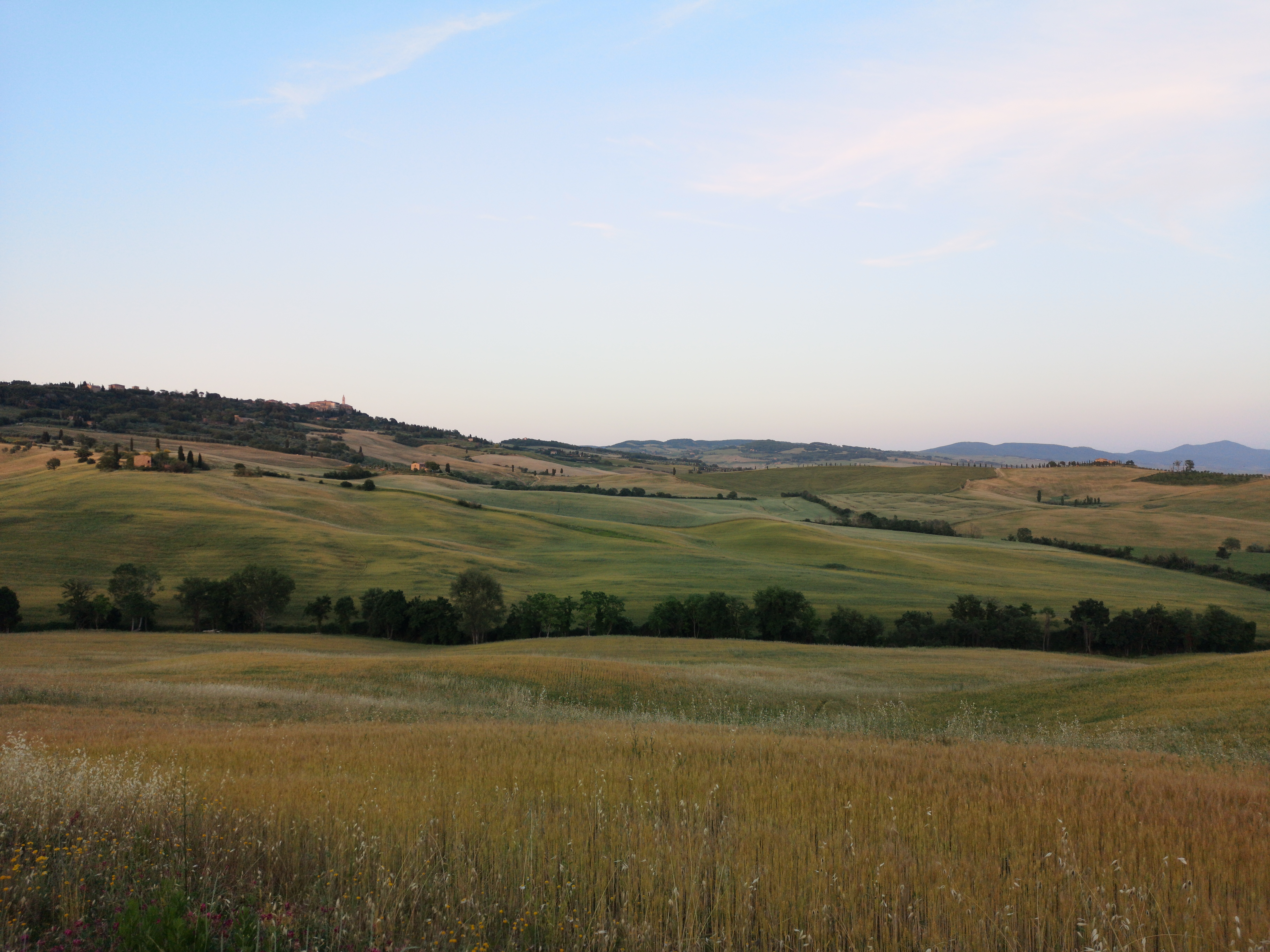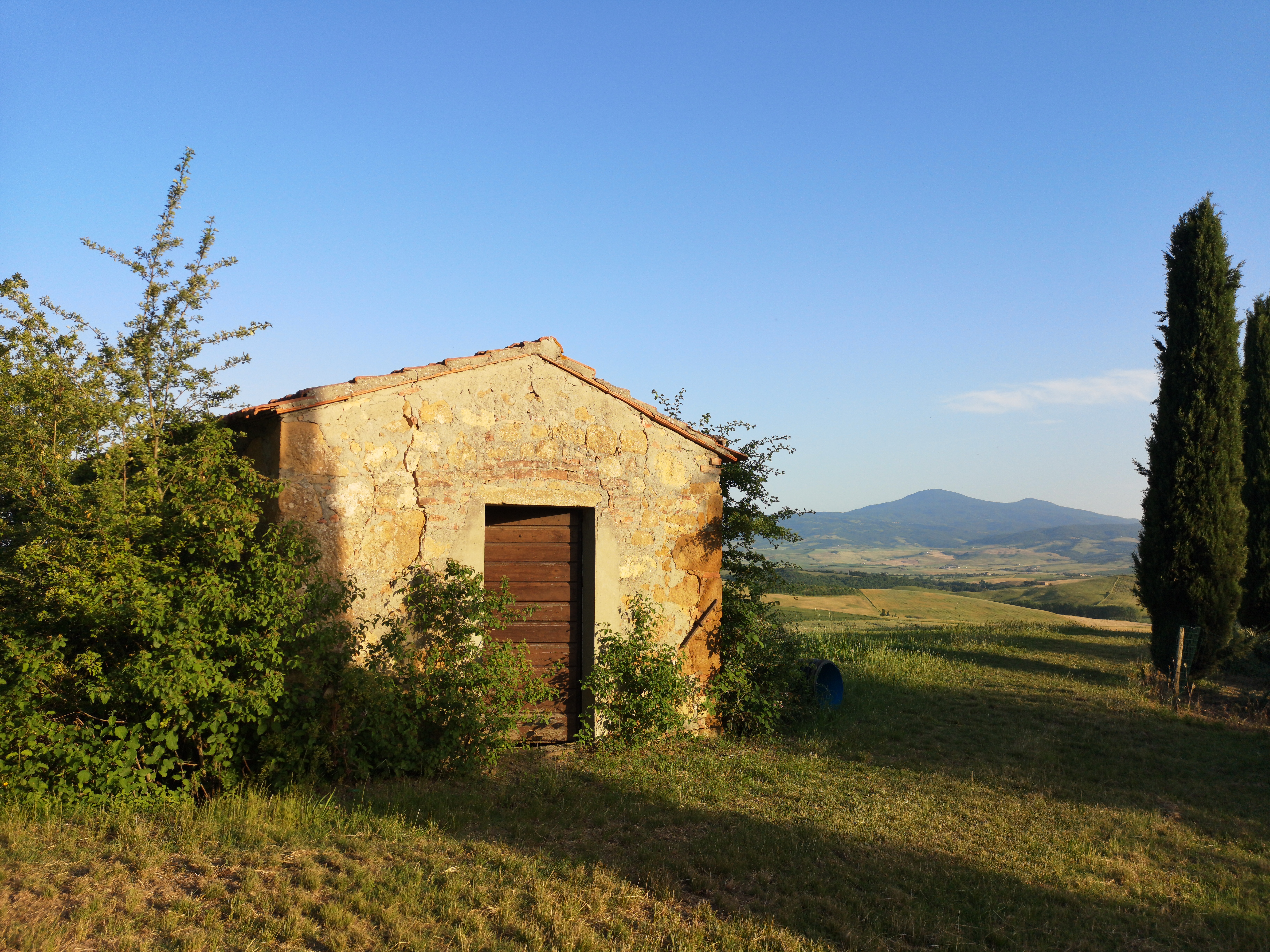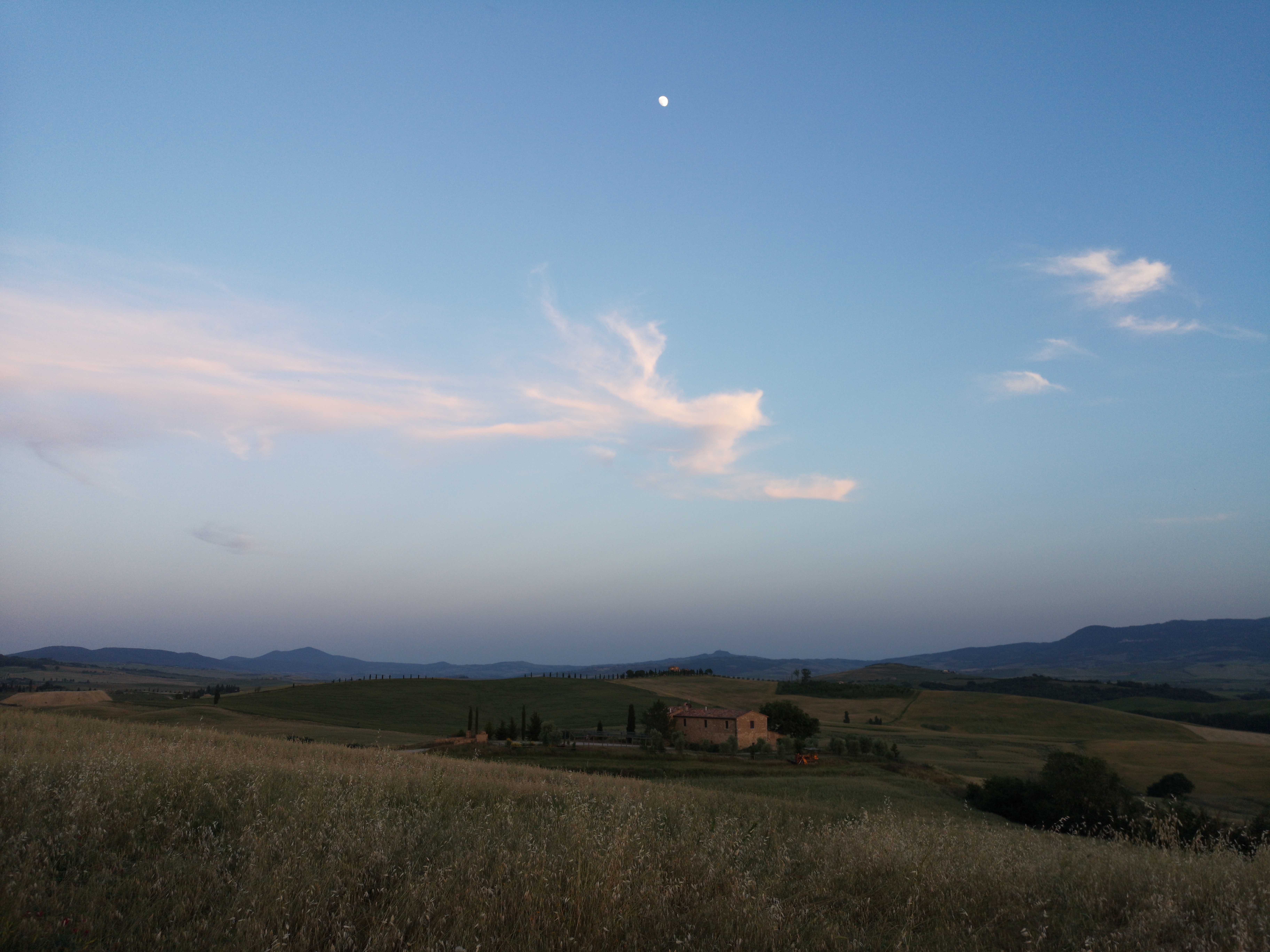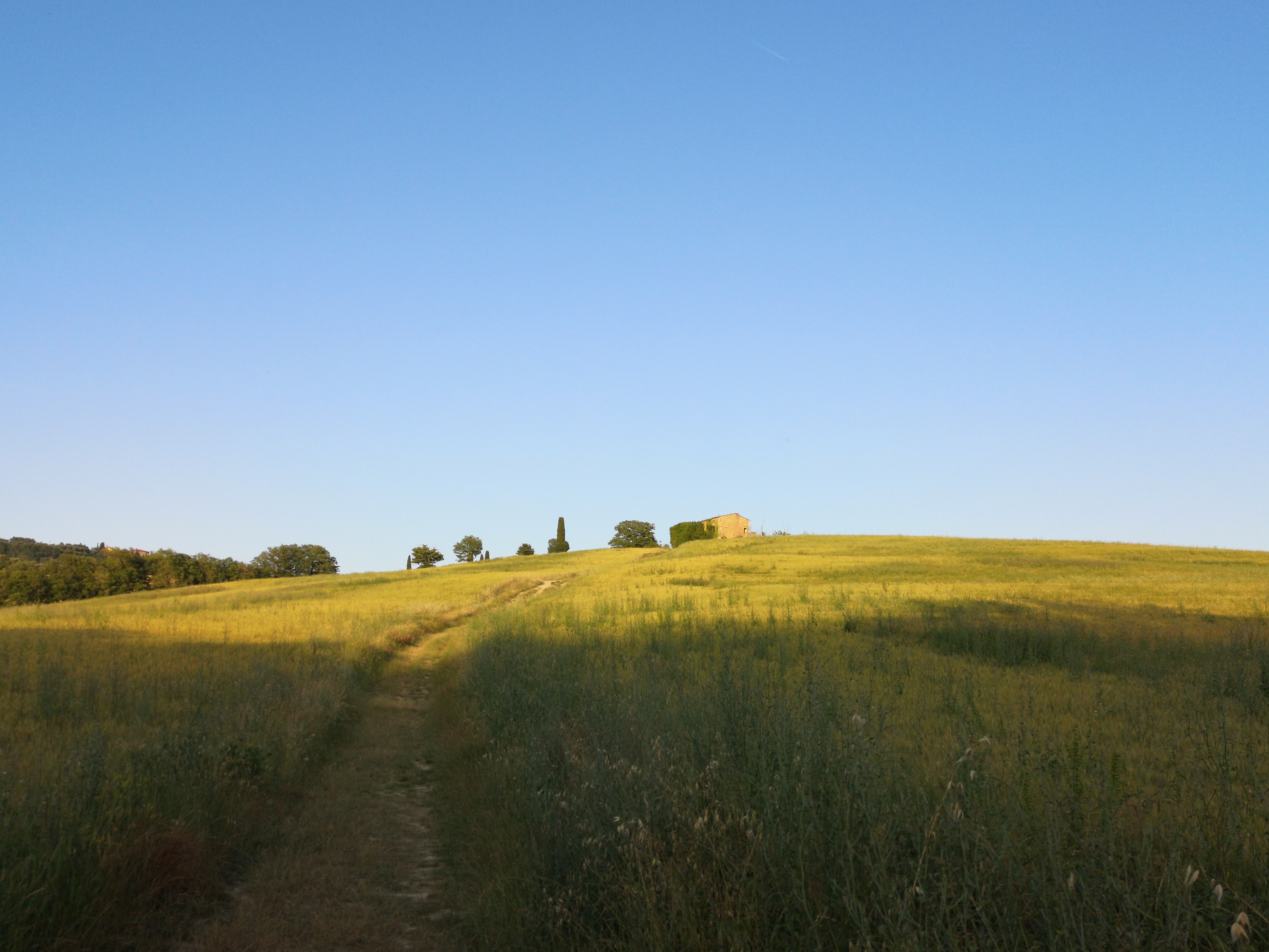 Die Kapelle steht recht einsam in der Landschaft und die kleine Strasse dahin ist zum Glück gesperrt. Wahrscheinlich bewahrt die Tatsache, dass man die letzten 700 Meter zur Kapelle zu Fuß gehen muss, diesem Ort ein wenig seine Ruhe. Der abendliche Weg durchs Tal war sehr entspannend und hat viel Spaß gemacht. Überhaupt war dies ein beeindruckender Tag für mich… ich habe heute zweimal die sogenannte „blaue Stunde“ mitten im Val d’Orcia verbracht. Nein, keine „Happy Hour“… ich war absolut nüchtern und freu mich jetzt auf morgen!